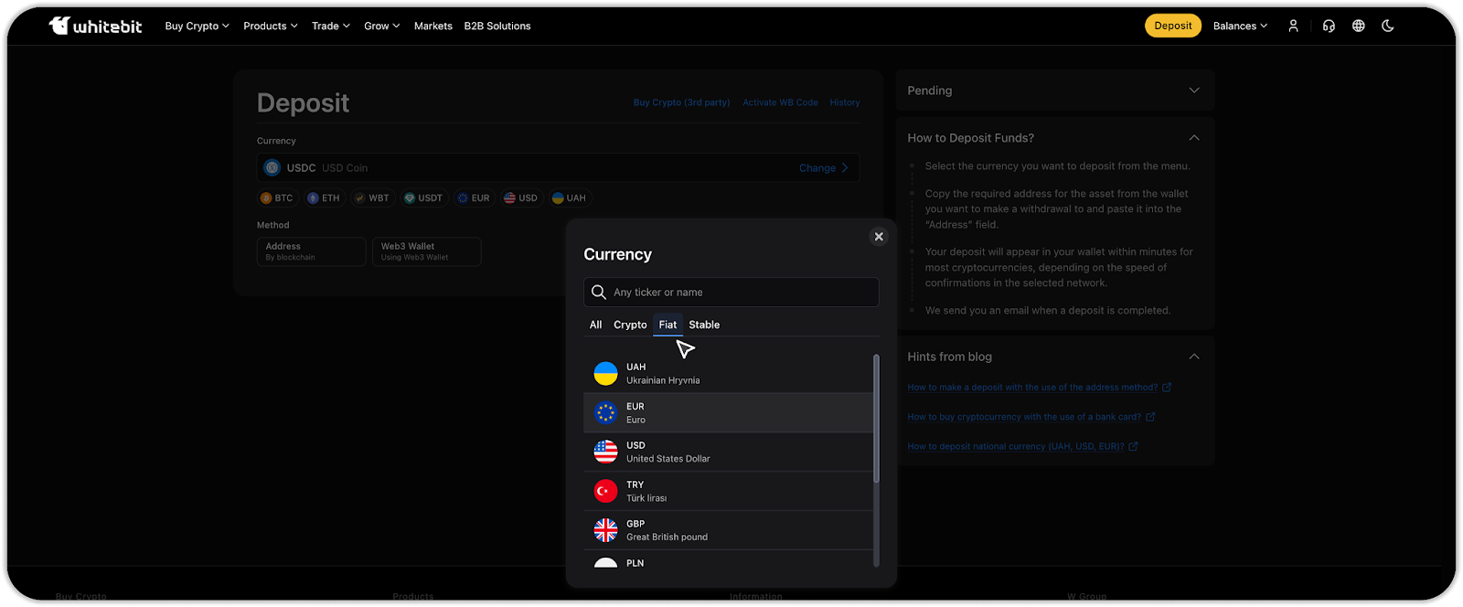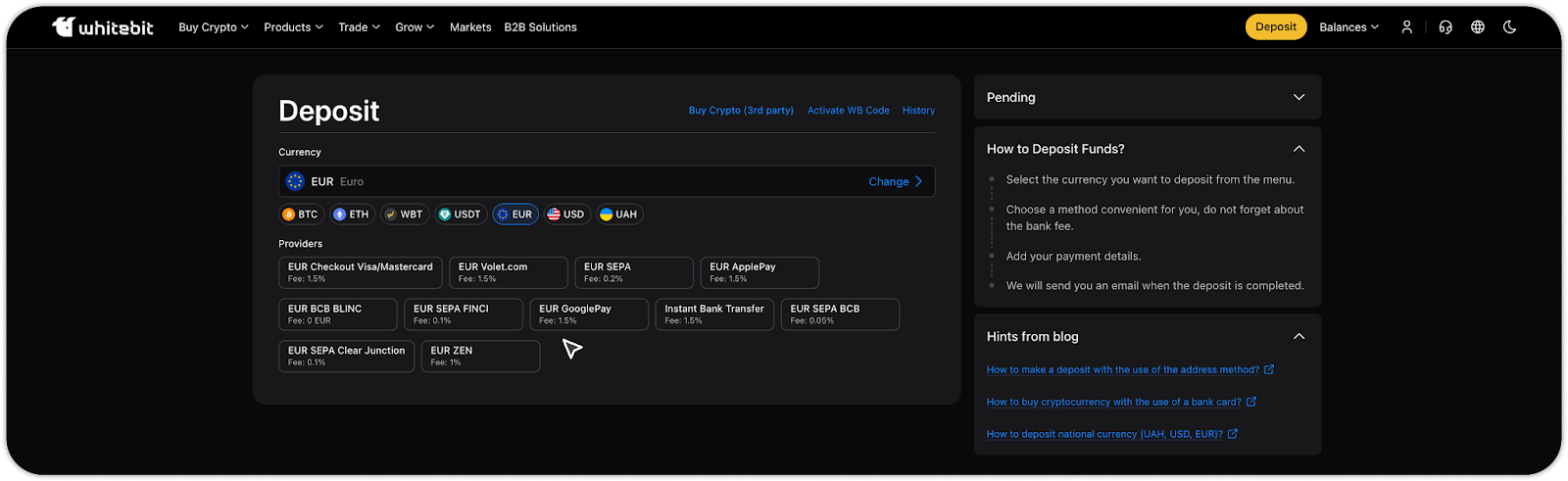 - Depositing of EUR SEPA balance on the WhiteBIT exchange