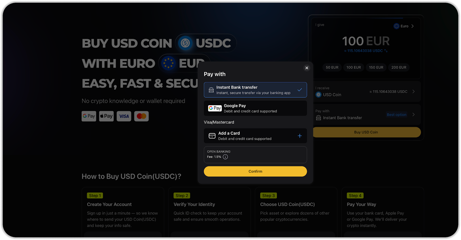 This is a simple way to buy cryptocurrency with fiat (government-issued currency) in just a few clicks. Here’s how to do it: