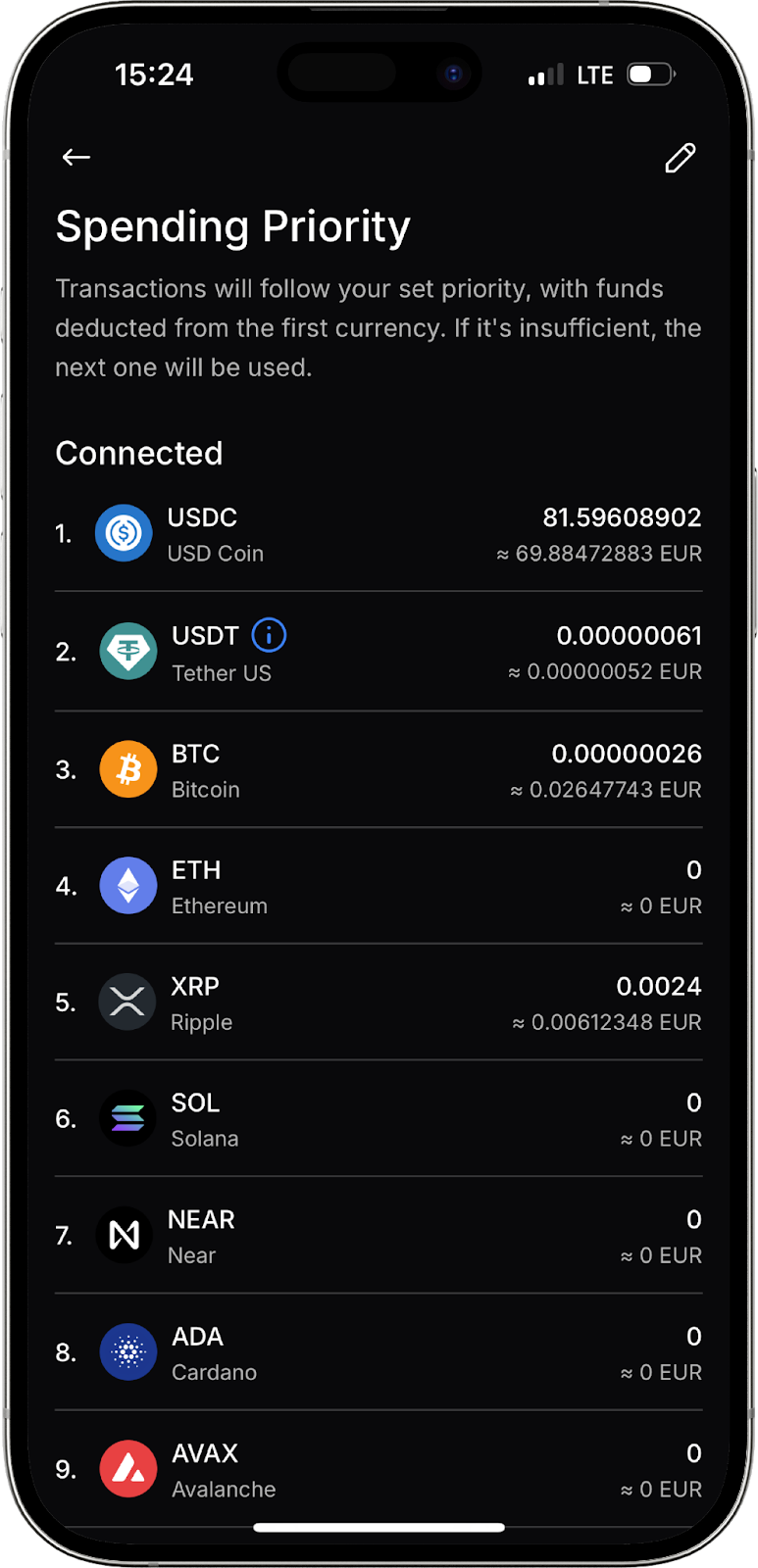 The asset tickers available for payments are listed under the balance sheet. When paying, the assets will be debited in the order they appear in the list, directly from the user's exchange balance. In the “Spending Priority” section, you can adjust the order in which assets are used. For example, if USDC is listed first, it will be spent first; if BTC is listed second, it will be spent after USDC, and so on. All assets available for payment are listed as follows: