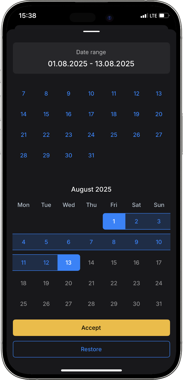 The minimum period for generating a report is 1 day, and the maximum is 1 year. You can select the period you need and click Accept.