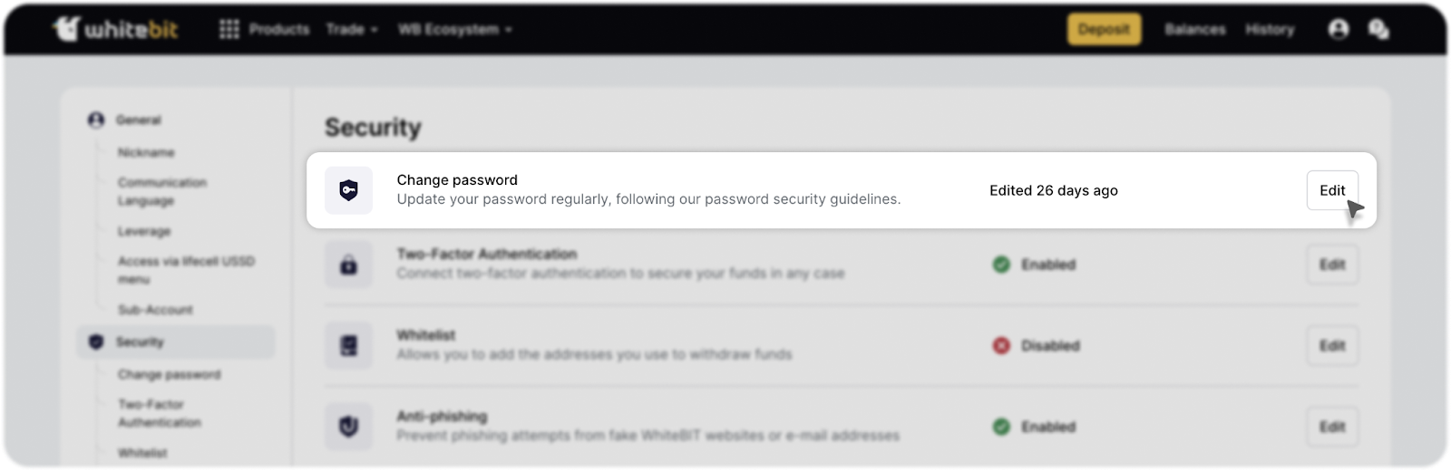 Next, select the "Change Password" tab in the menu on the left or click the "Edit" button in the Change Password section (first line on the page).