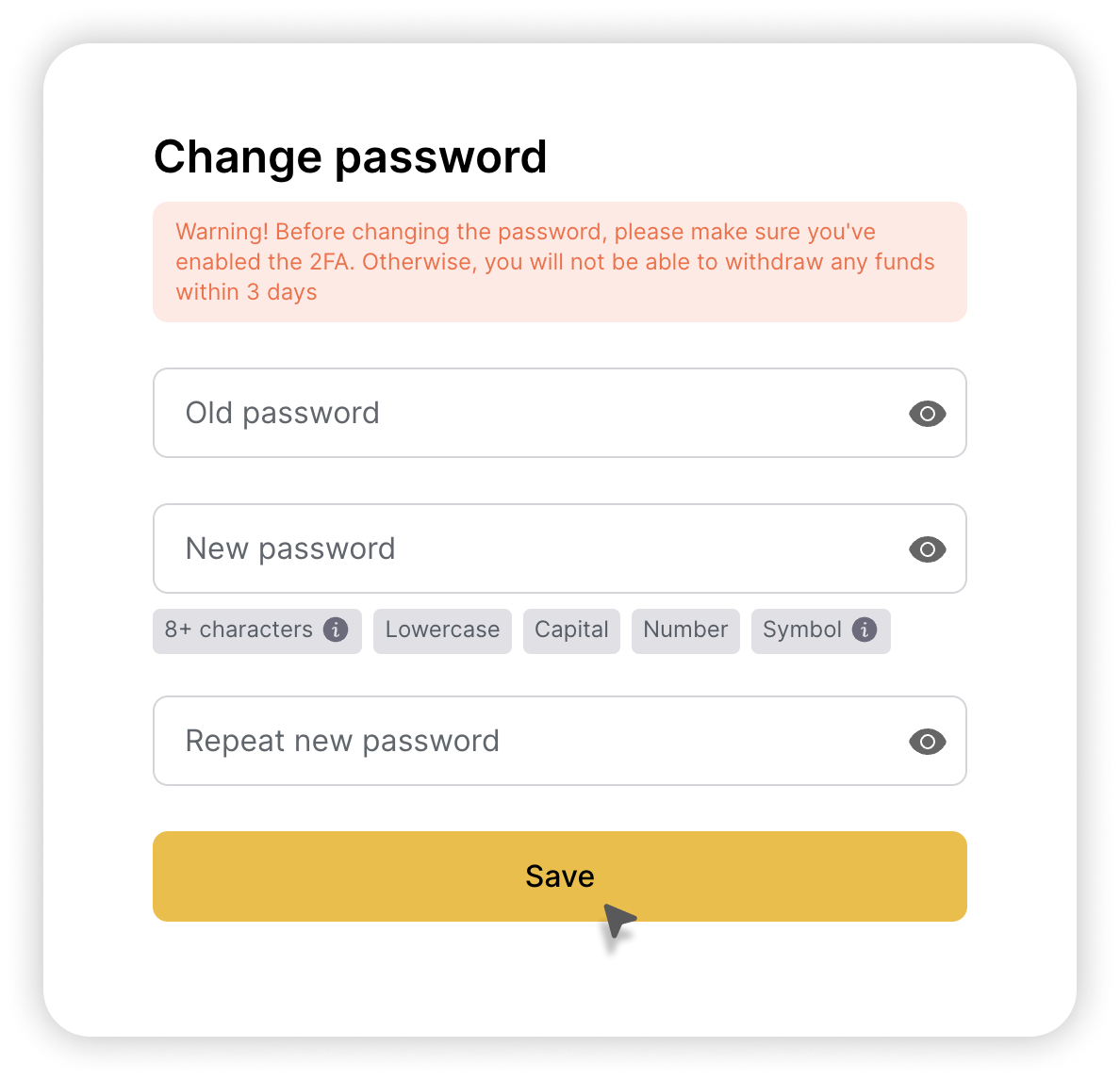 Please note: if 2FA or Passkey are not enabled, fund withdrawals are temporarily restricted for 72 hours after a password change. We recommend securing your account and enabling two-factor authentication, which will also allow you to withdraw funds immediately after changing your password.