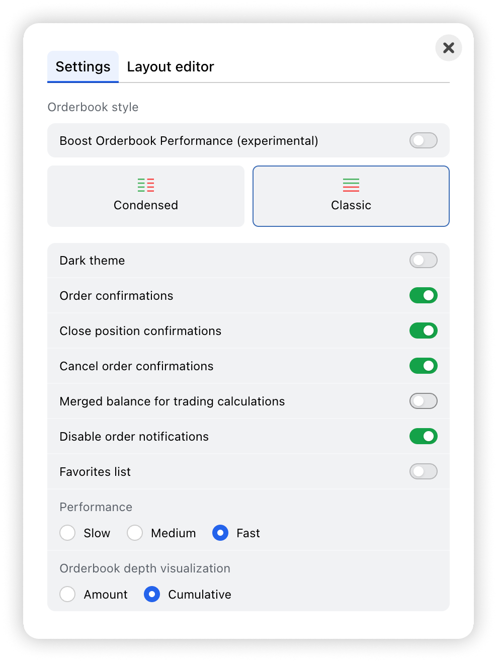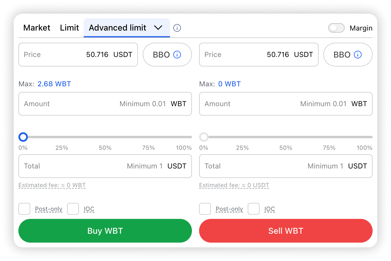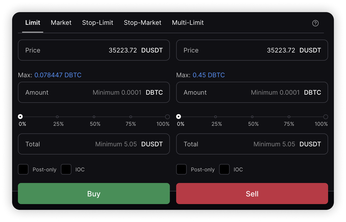 Important: if you have disabled the “Merged balance for trading calculations” function in the order book style settings, your funds must be in the trading balance to place an order.