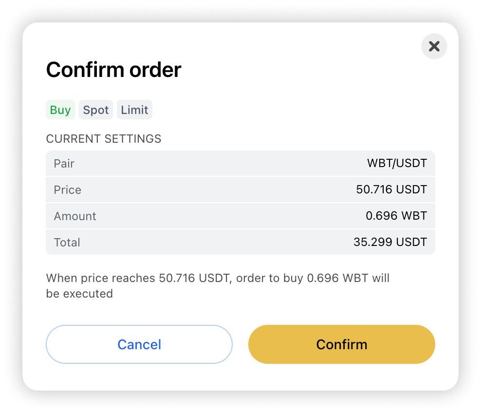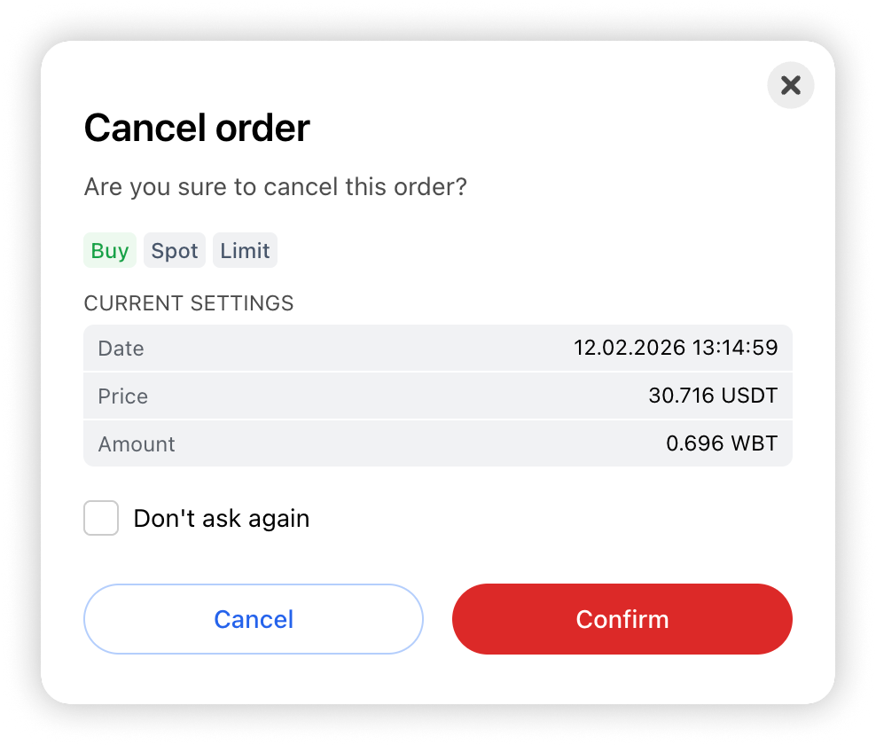 In the pop-up window, confirm the order cancellation. (The funds reserved in the order will be returned to your Trading Balance).
