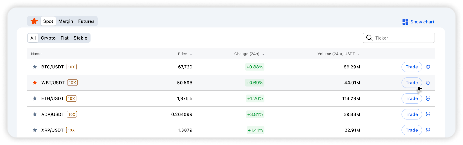 All orders for a selected trading pair are displayed in the order book on the trading page to the right of the chart.