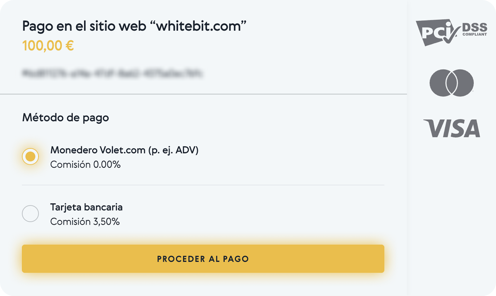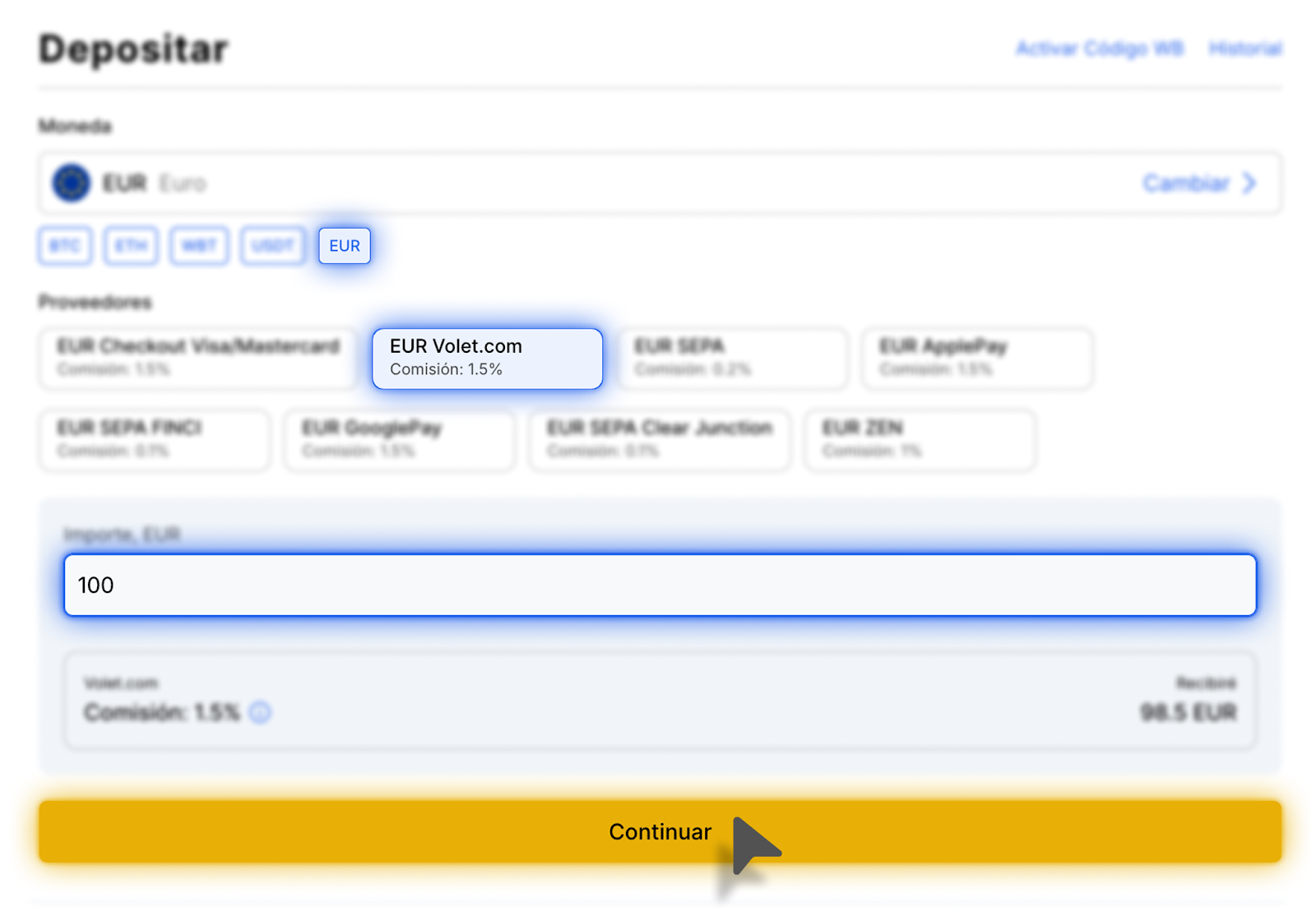 En WhiteBIT, es posible depositar y retirar monedas fiduciarias como: EUR, GBP, KZT, TRY y USD a través de Volet.com. En este artículo, realizaremos un depósito en EUR utilizando este método de pago.