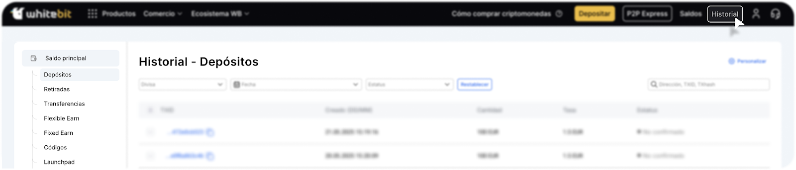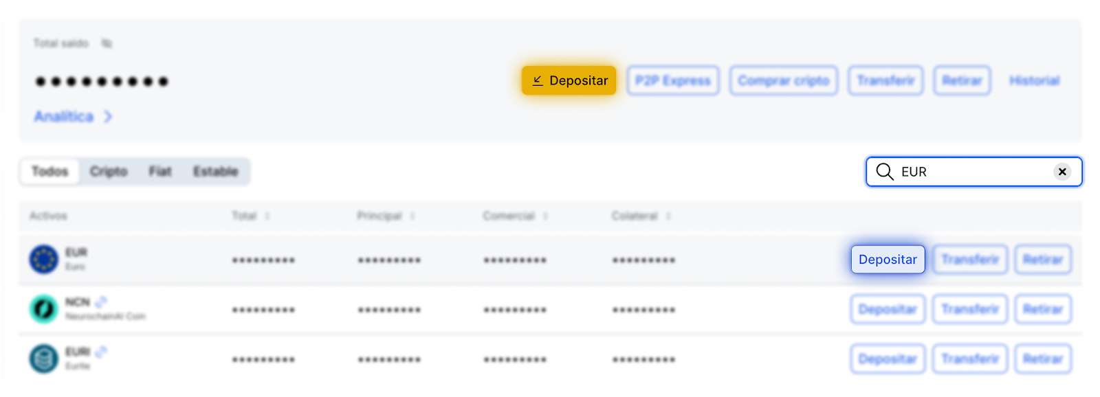 En la pestaña "Depósitos" estarán disponibles los detalles de su transacción. Una vez procesada la transacción, los EUR serán acreditados en su saldo.
