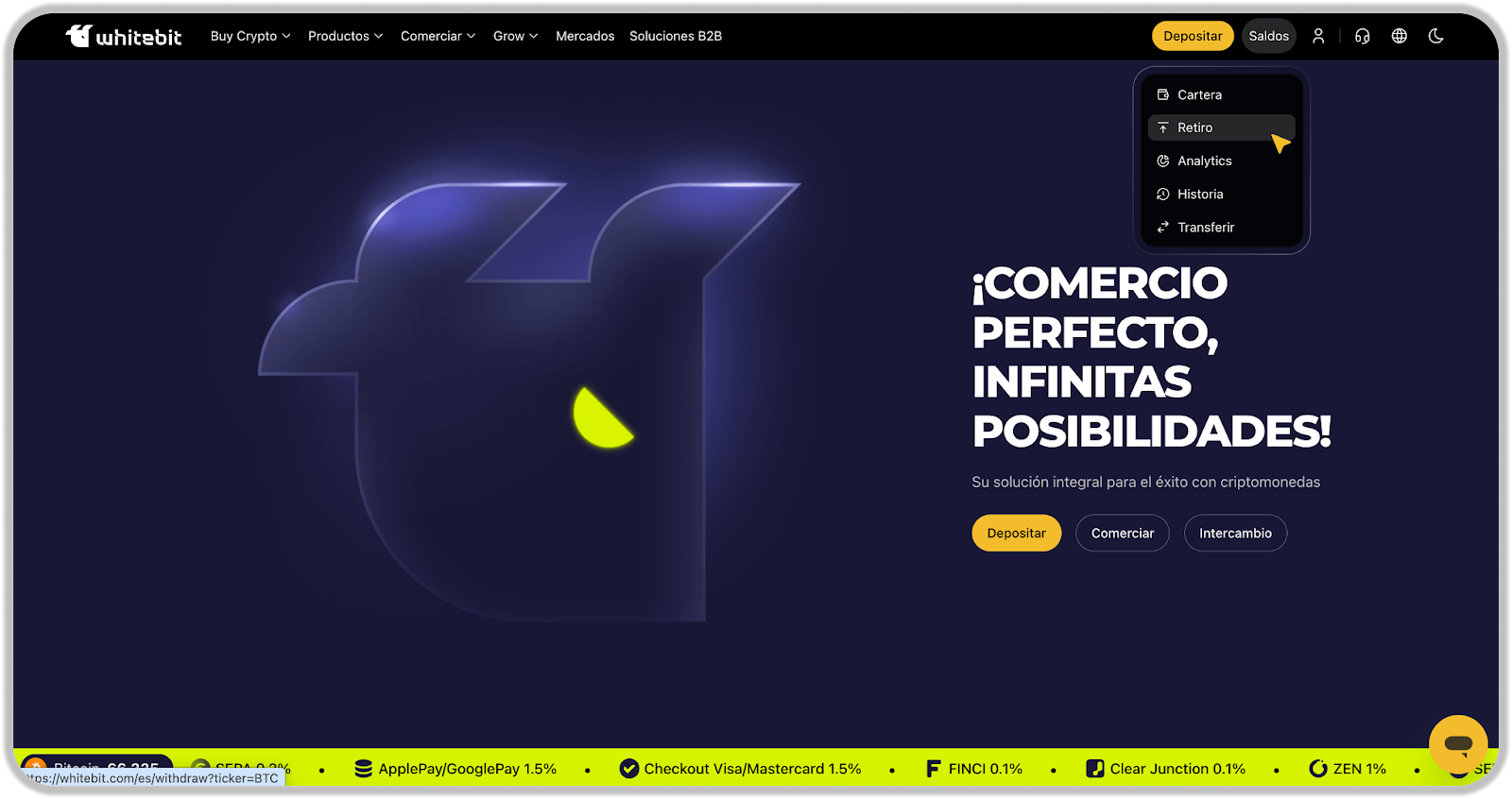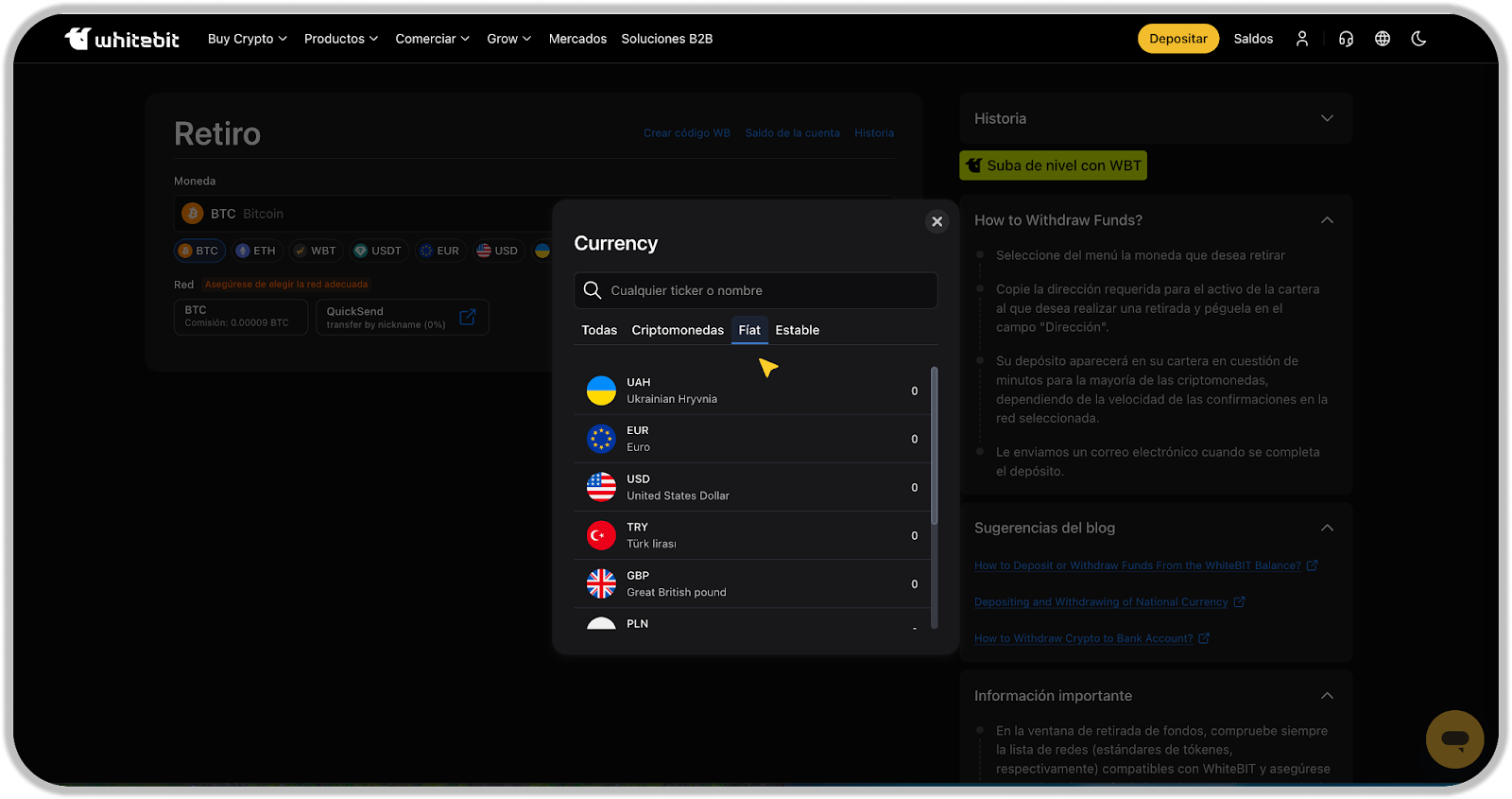 Antes de iniciar el retiro, verifique que el activo deseado esté en su saldo Principal. El traslado entre balances se realiza manualmente a través del botón “Transferir” en la pestaña “Cartera”.