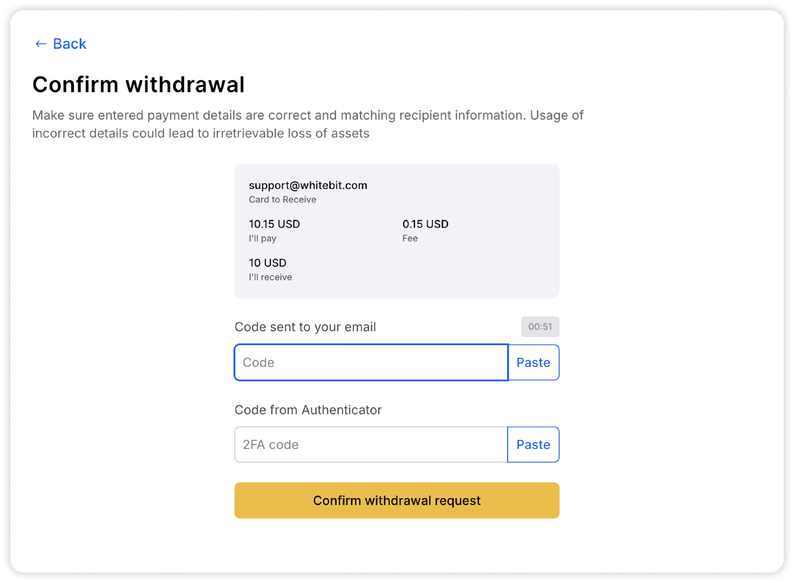 Deberá confirmar el retiro con un código que se enviará al correo electrónico asociado a su cuenta de WhiteBIT, así como mediante 2FA (si tiene activada la autenticación de dos factores o la Clave de Acceso).