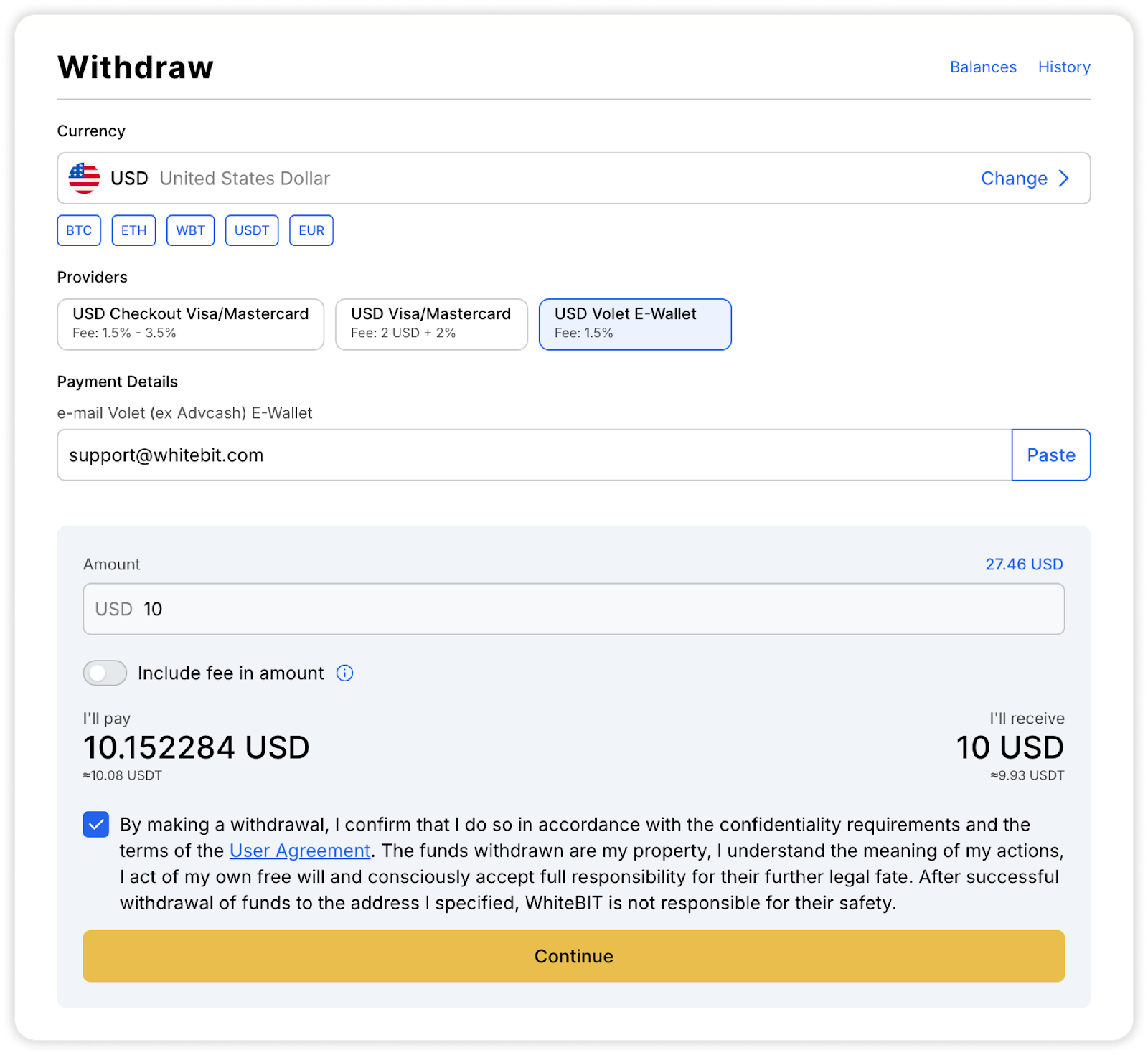Una vez que los fondos estén en el saldo Principal, puede proceder con el retiro en sí. A continuación, explicamos paso a paso cómo retirar fondos desde WhiteBIT utilizando USD (dólares estadounidenses) como ejemplo:
