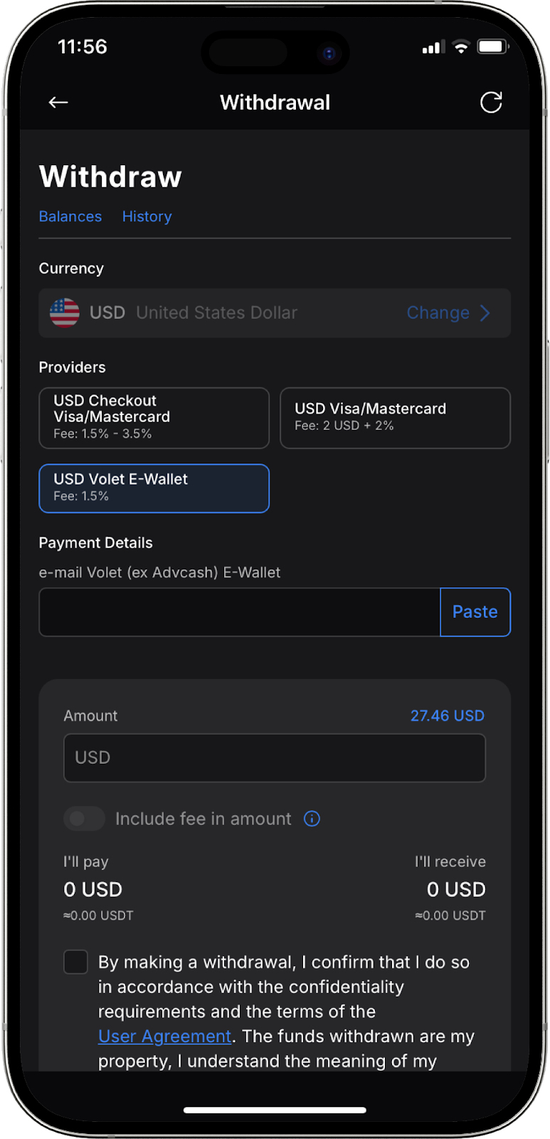 Revise la información importante ubicada en la parte superior de la ventana de retiro. Seleccione un proveedor para realizar el retiro, rellene los campos necesarios con los datos de pago (la información requerida puede variar según el sistema de pago elegido) y especifique la cantidad a retirar.