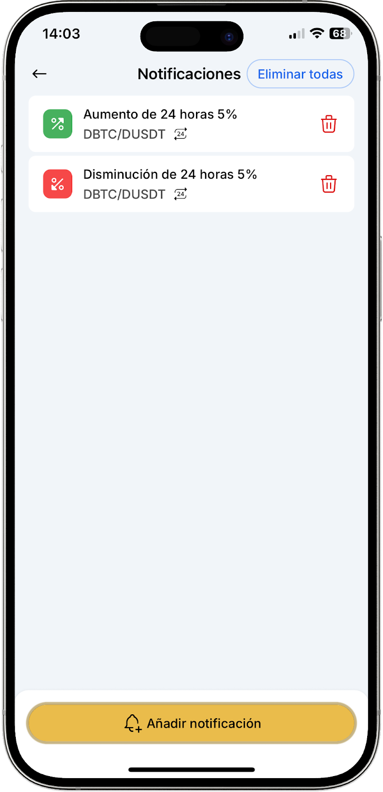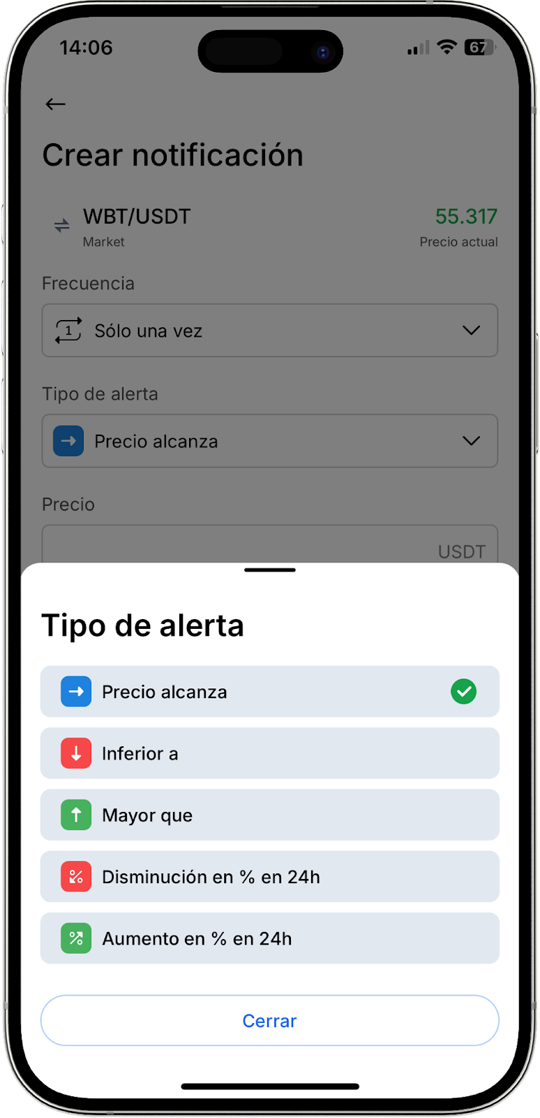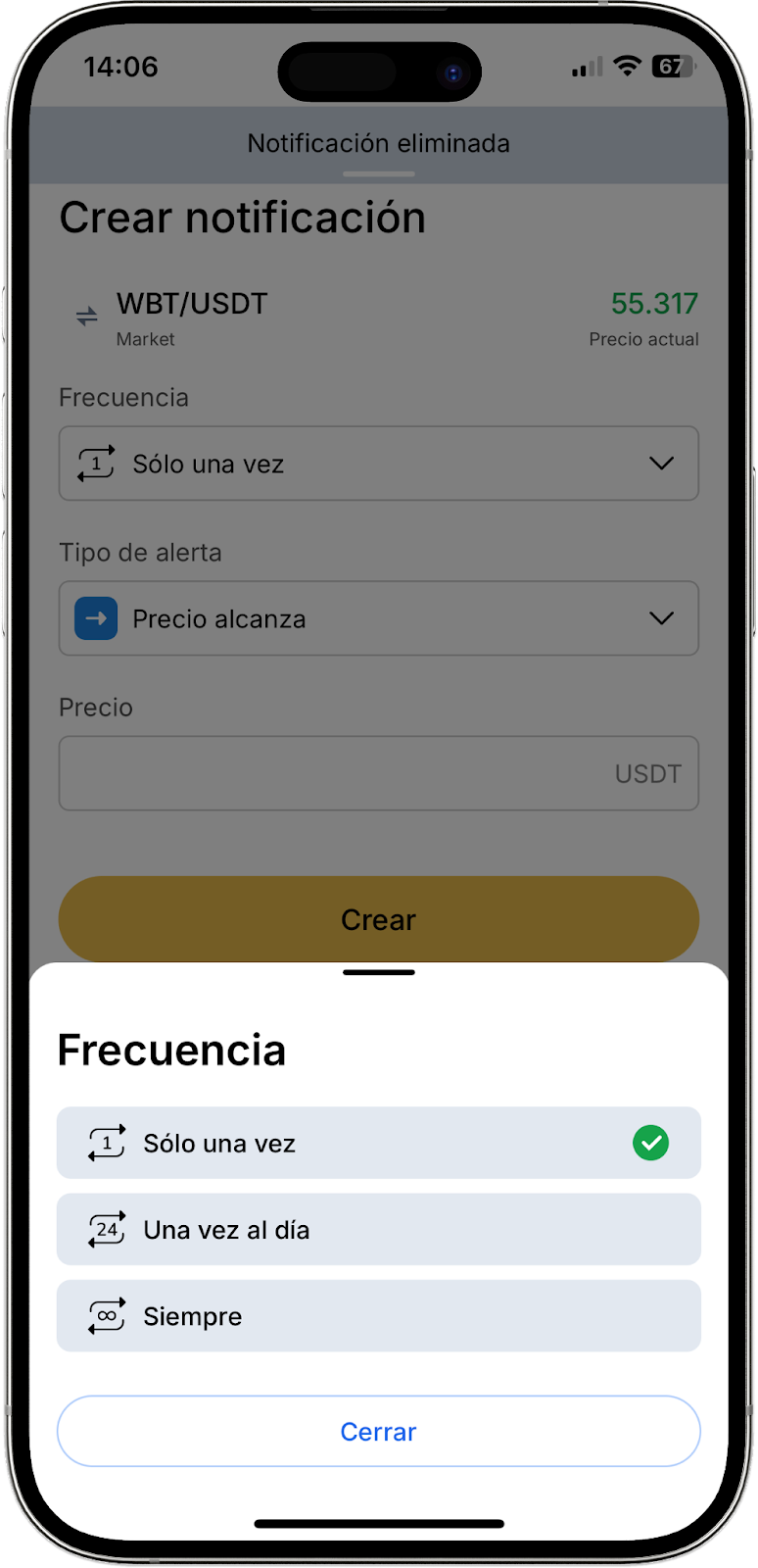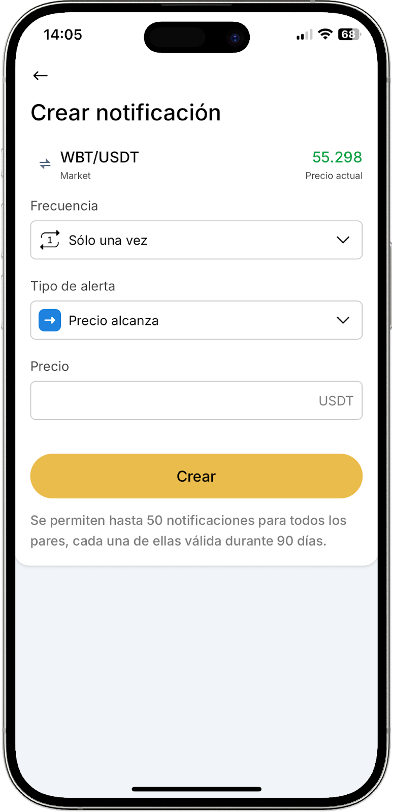 Las notificaciones de precios le ayudan a rastrear los cambios en los precios de los activos digitales en el mercado. Puede configurar notificaciones cuando el precio alcance un determinado valor, así como la frecuencia de estas notificaciones.