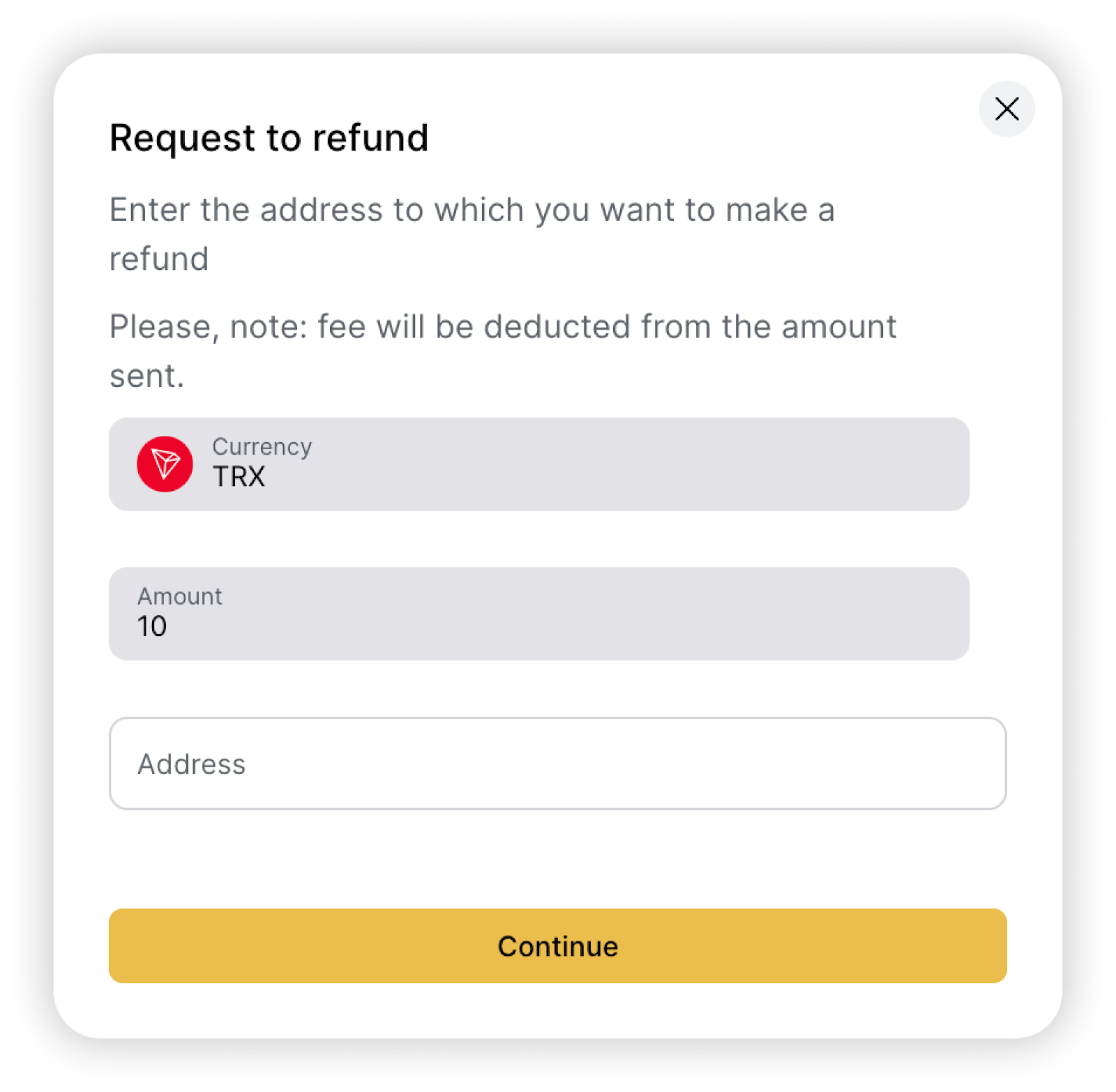 Importante: La dirección que proporcione para el reembolso no debe pertenecer a nuestro intercambio. Además, asegúrese de que todos los detalles sean correctos, ya que esta transferencia no se puede cancelar ni reenviar una vez confirmada.