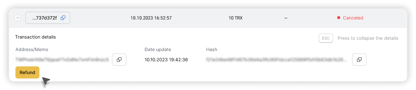 Además, para algunas transacciones puede estar disponible la opción de reembolso (Refund). En ese caso, el equipo de soporte se lo comunicará debidamente.