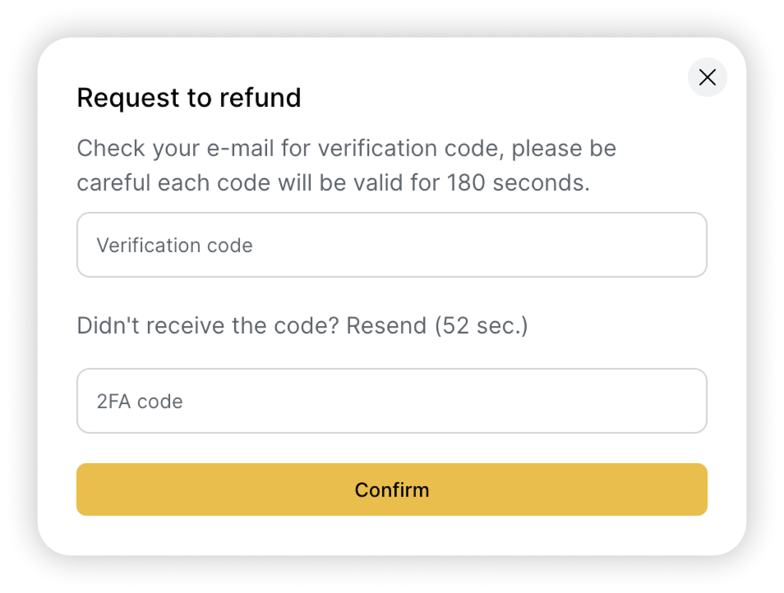 3. Confirme la creación de la solicitud de "Reembolso". Recibirá un código por correo electrónico. Introdúzcalo en el campo correspondiente en la ventana de confirmación. También deberá introducir el código 2FA (si la función está habilitada en su cuenta).