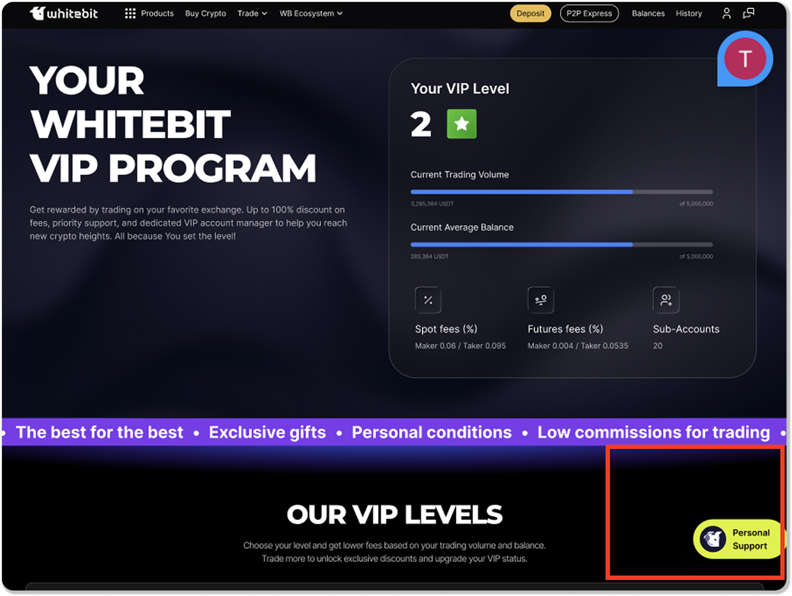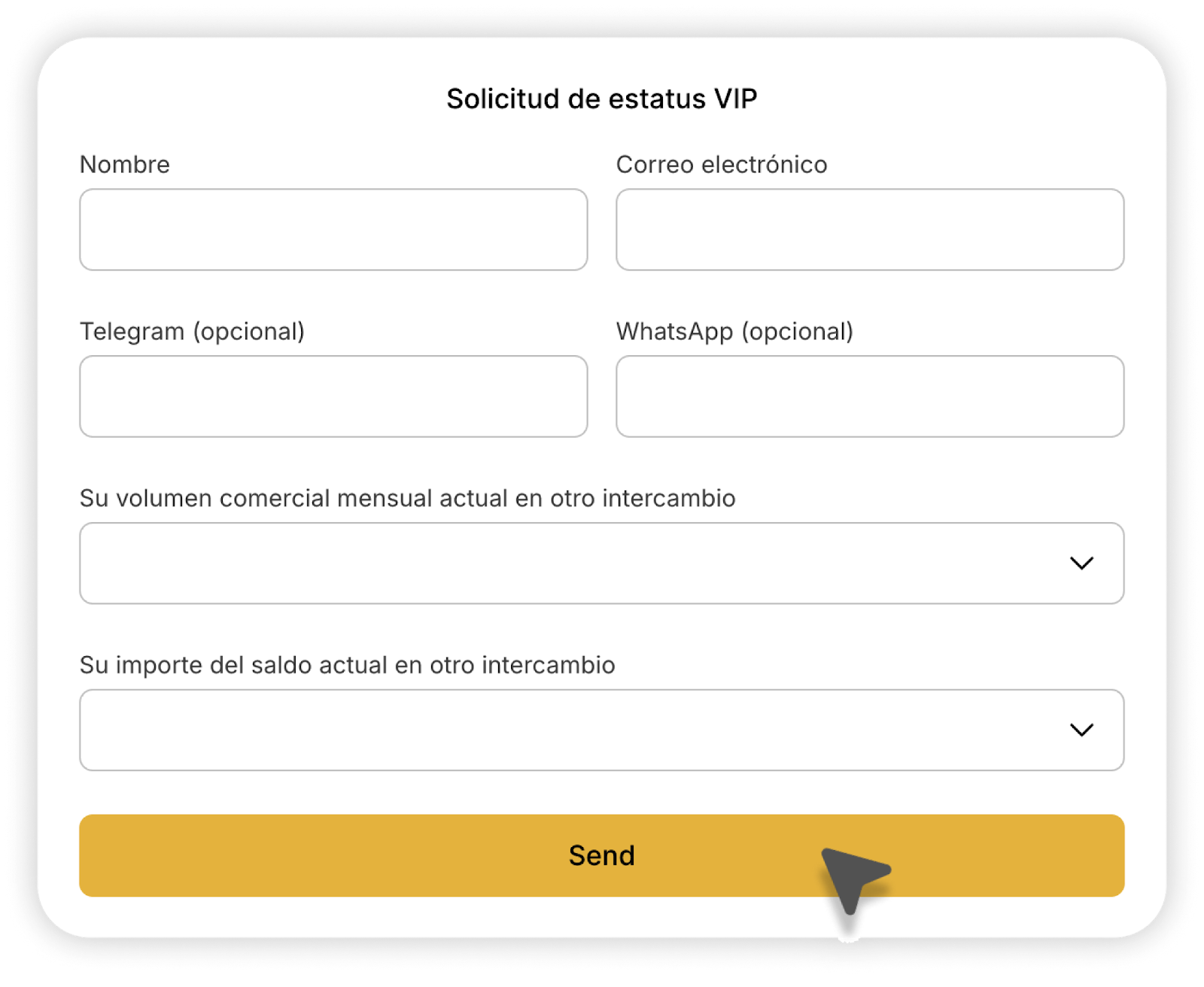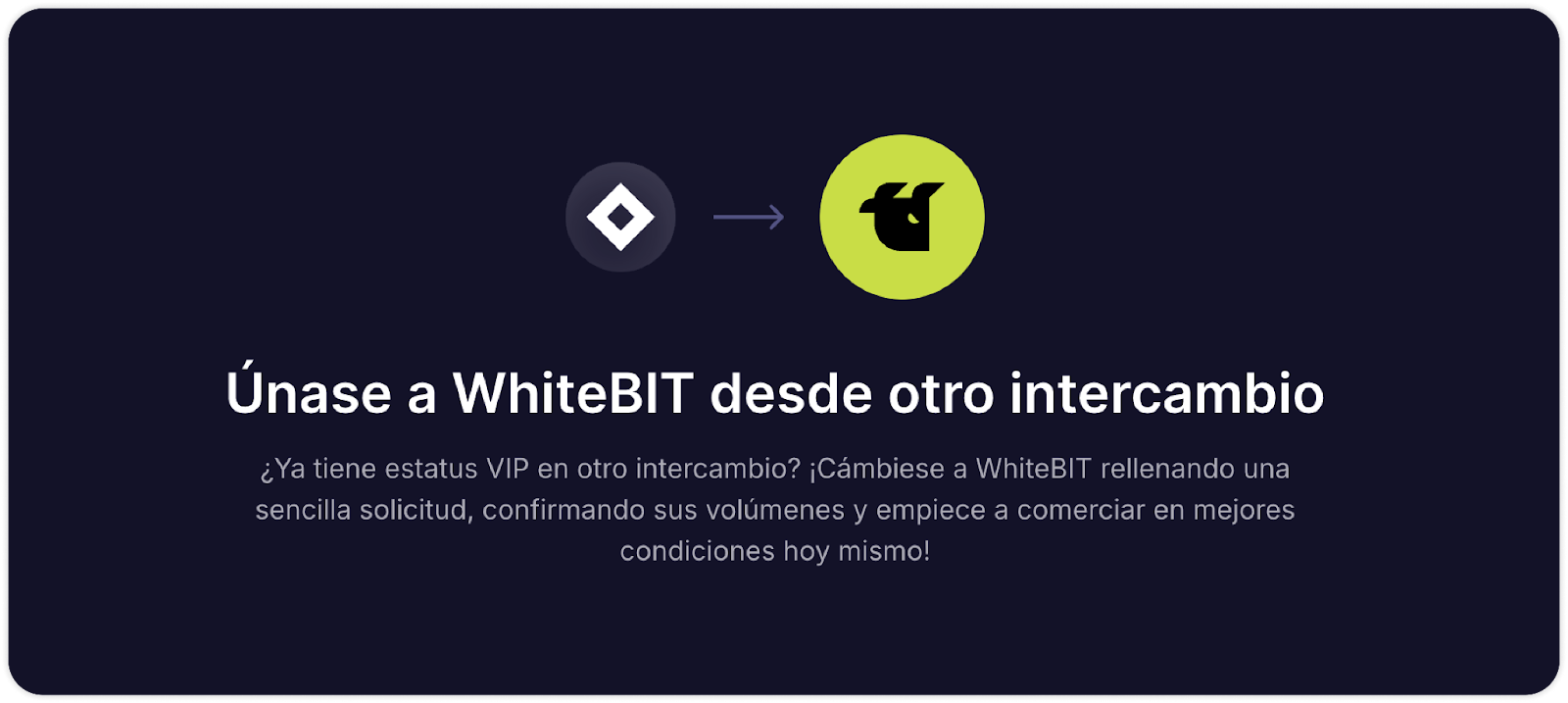 Para cambiar de otro intercambio y hacerse miembro del programa VIP de WhiteBIT, debe confirmar su volumen y saldo comercial mensuales. Para hacer esto, simplemente, complete el formulario de solicitud VIP introduciendo su nombre, correo electrónico, contactos de mensajería y su volumen comercial y saldo en otro intercambio. Nuestros especialistas se comunicarán con usted lo antes posible para coordinar los detalles y confirmar su nuevo estatus en nuestro intercambio.
