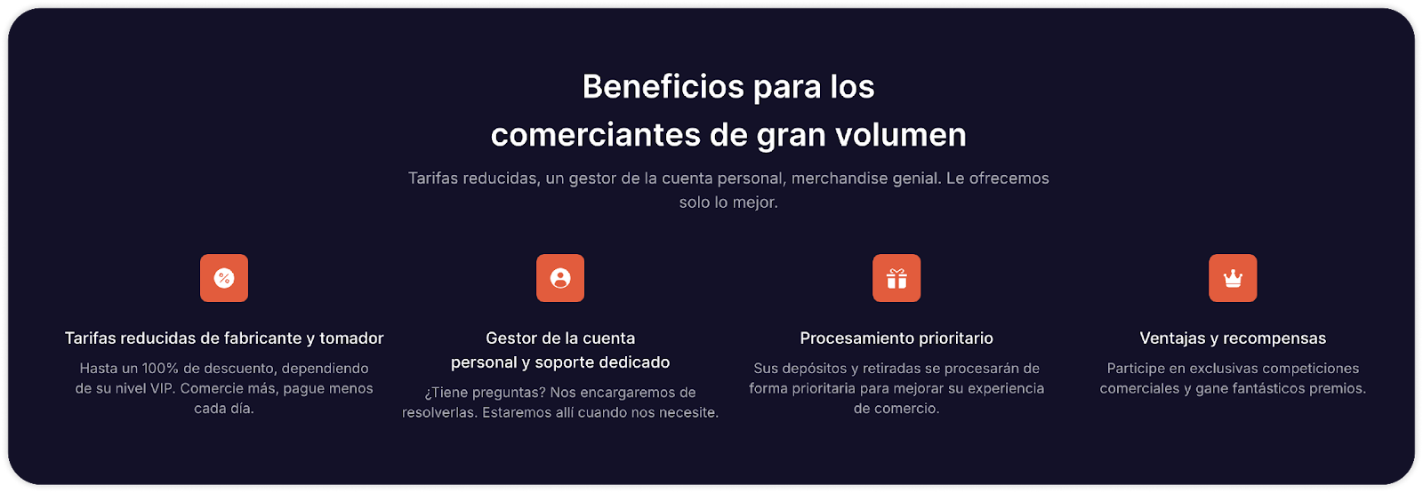 ¡El programa VIP brinda a sus miembros la oportunidad de obtener un descuento de hasta el 100% (dependiendo del nivel VIP) en las comisiones comerciales y participar en competiciones comerciales exclusivas, además brinda soporte prioritario para cualquier consulta y ofrece a los usuarios VIP la asistencia de un gerente personal VIP, listo para ayudar 24 horas al día, 7 días a la semana!