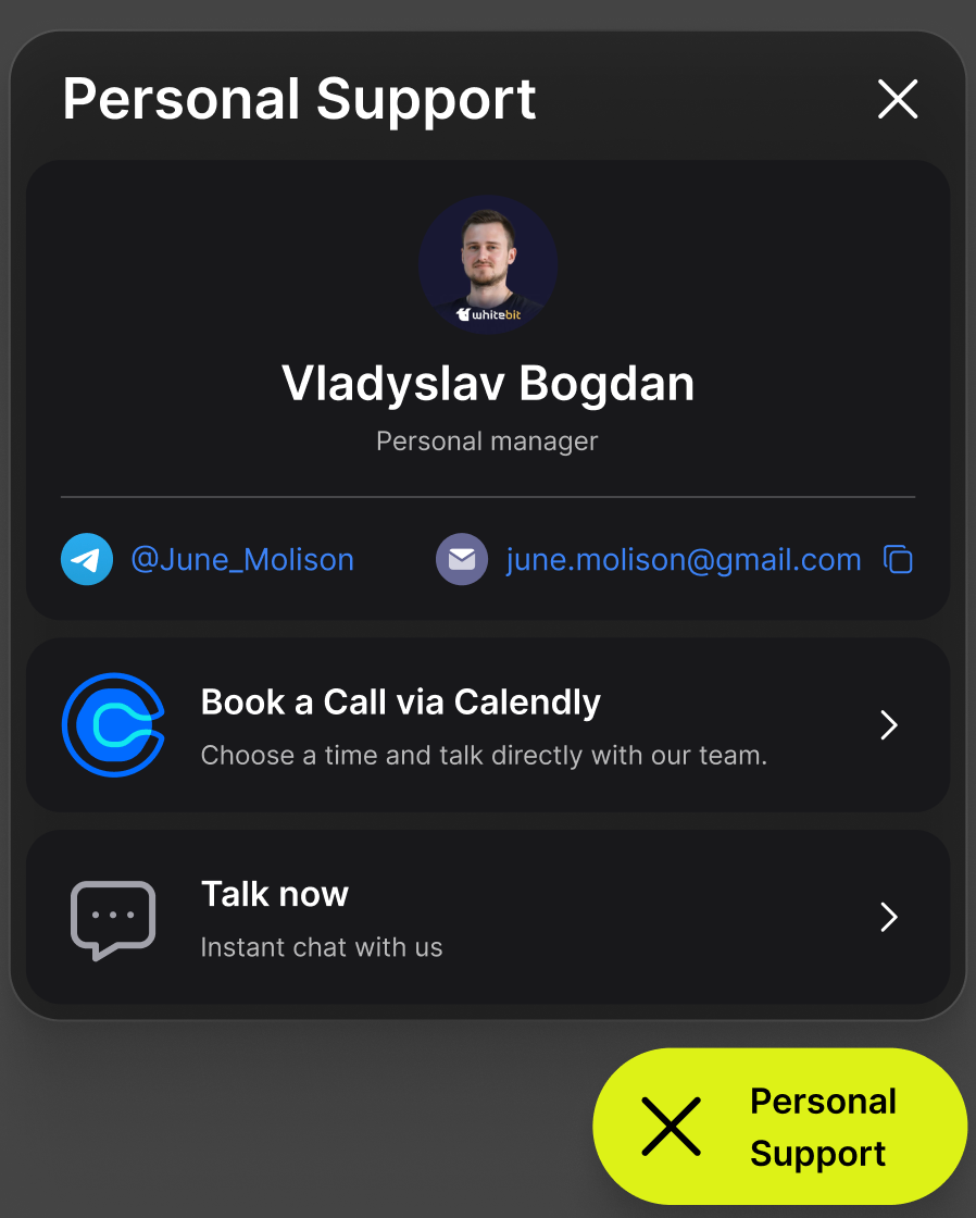 El botón Personal Support (Soporte personal) se encuentra en la esquina inferior derecha del sitio, está marcado en color amarillo y está disponible en todas las páginas. A través de este widget, puede contactar rápidamente con su gerente de la forma que le resulte más conveniente.