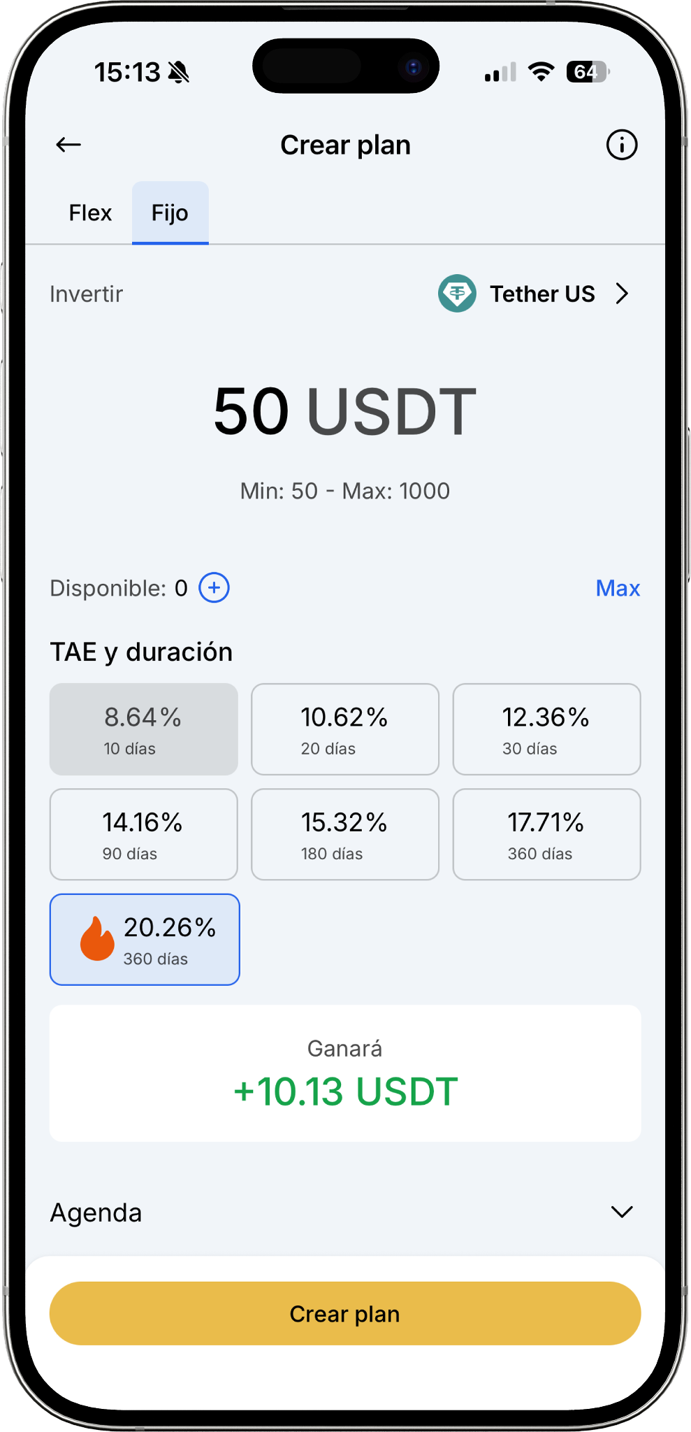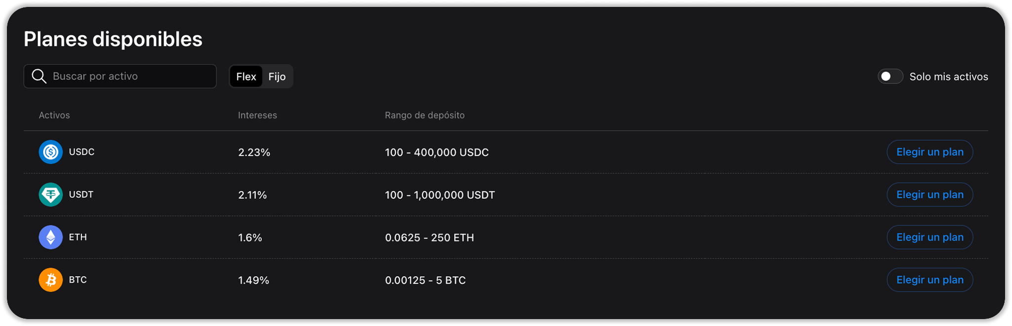 En esta lista, puede ver los intereses que recibirá una vez finalizado el período seleccionado. También puede ver el importe mínimo y máximo de fondos para abrir un plan de Crypto Lending para cada activo.