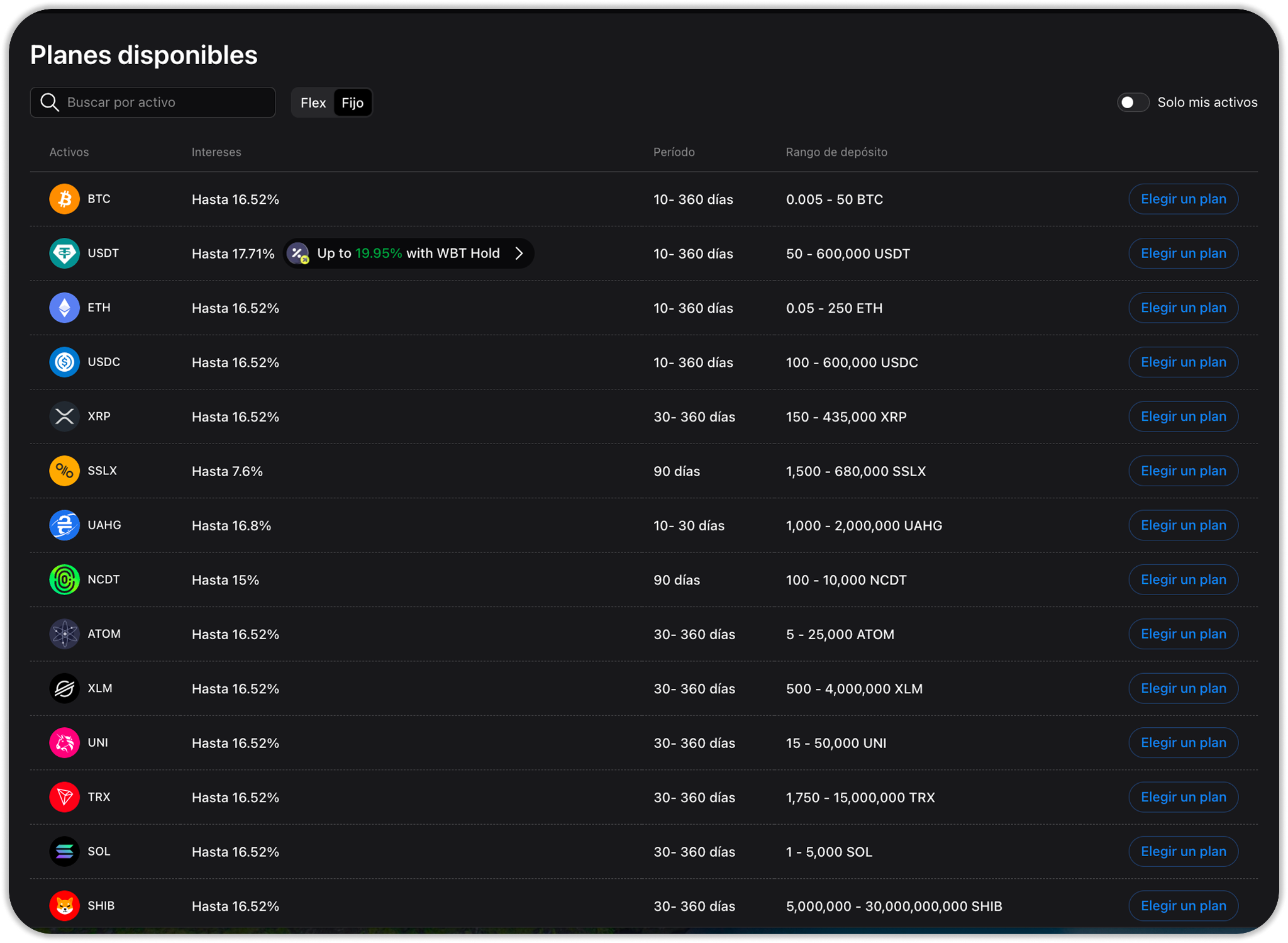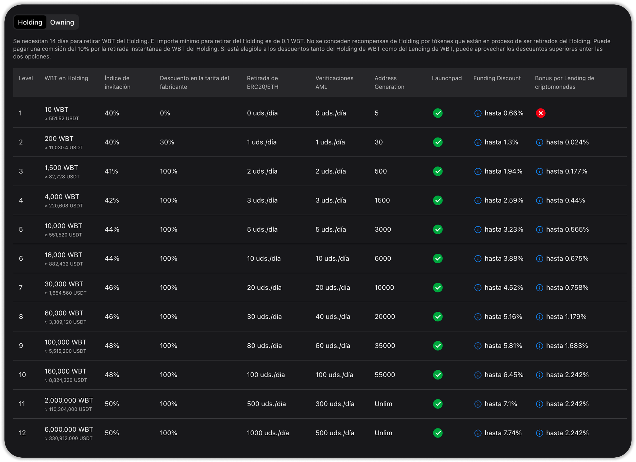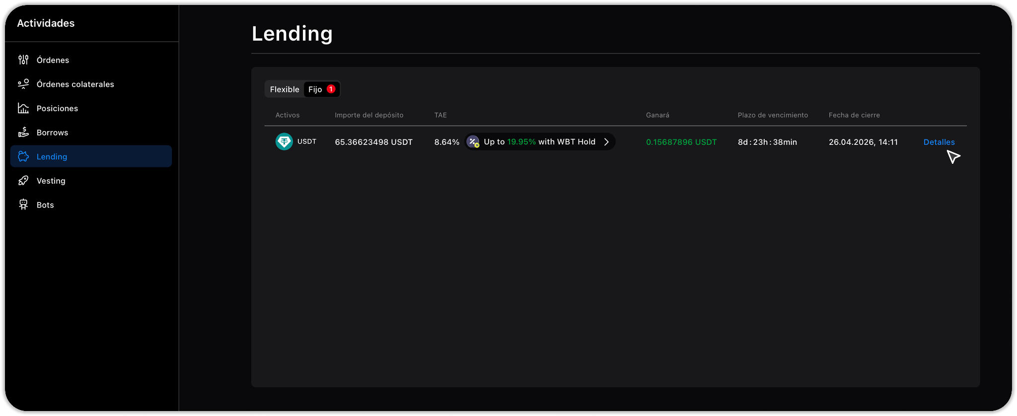 Al invertir fondos en planes de Crypto Lending para el activo Tether US (USDT), los usuarios pueden recibir una bonificación adicional al bloquear tokens de WBT en Holding (Retención).