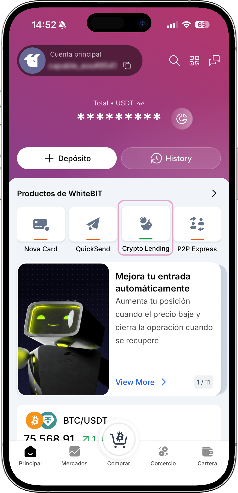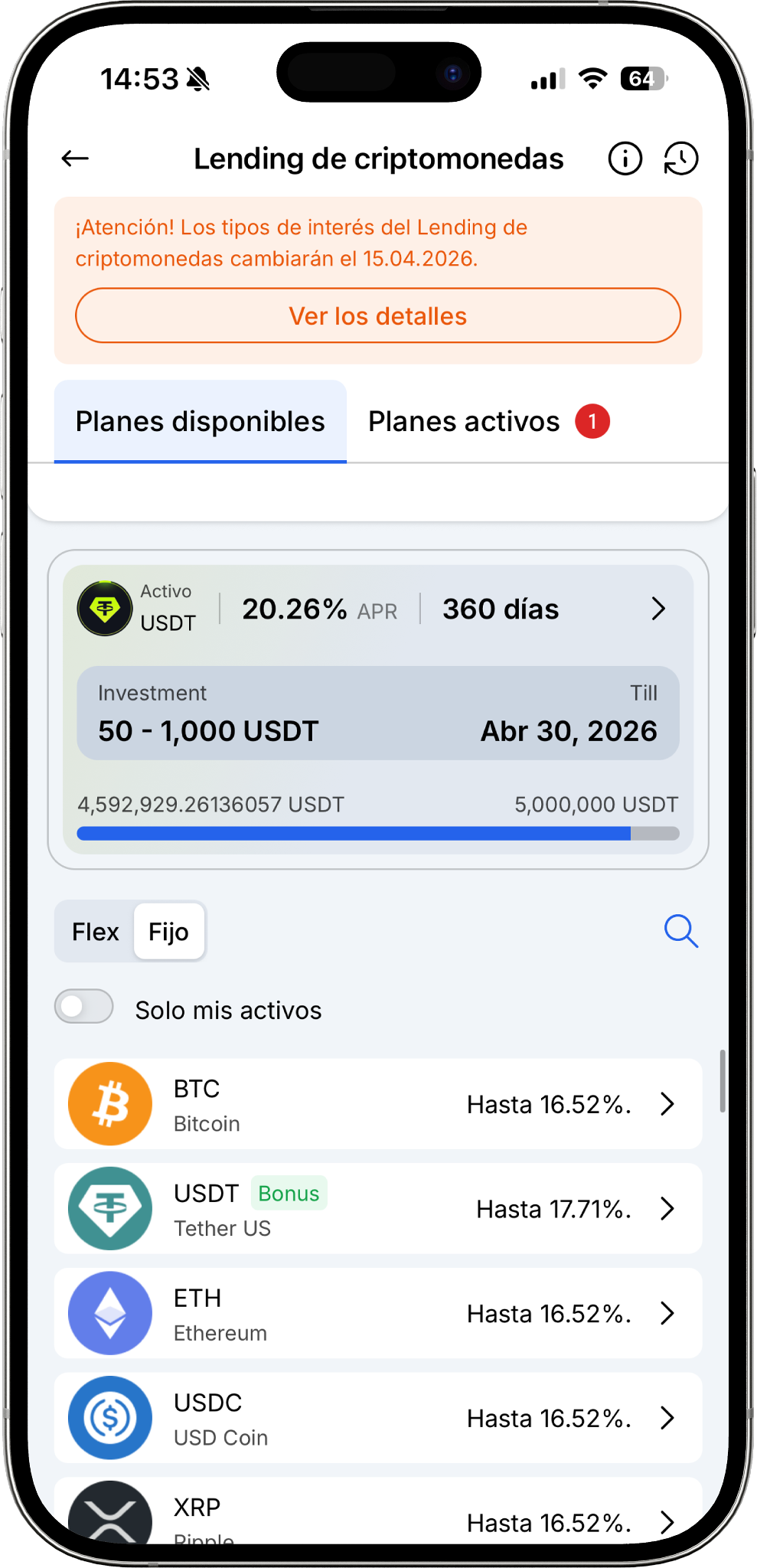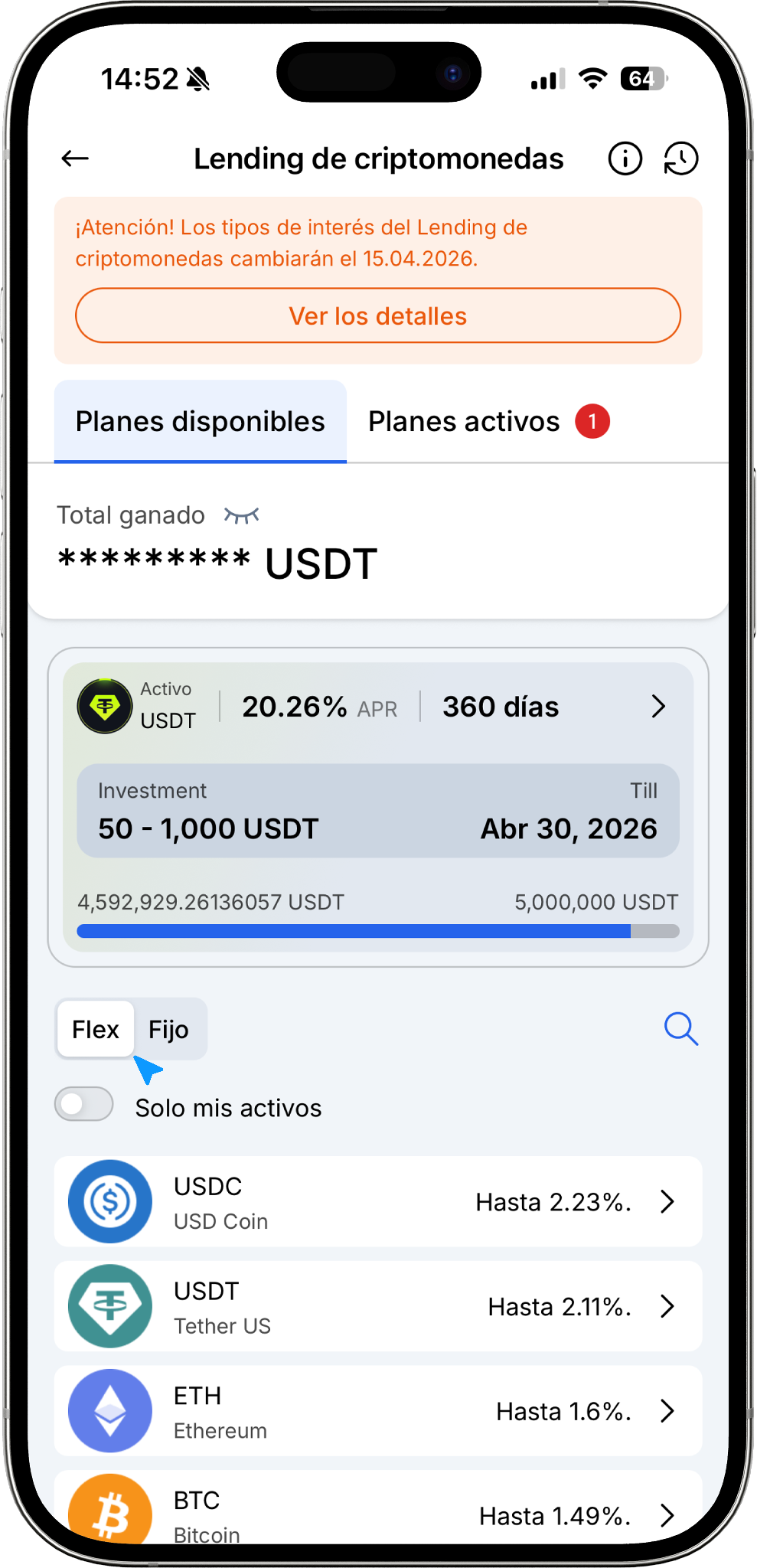 Al invertir fondos en planes de Crypto Lending para el activo Tether US (USDT), los usuarios pueden recibir una bonificación adicional al bloquear tokens de WBT en Holding (Retención).