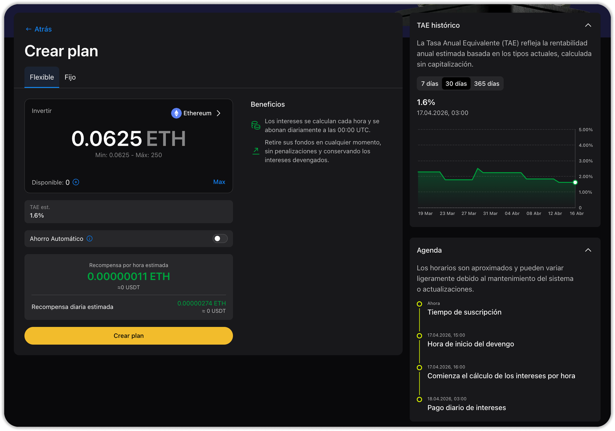 Tenga en cuenta que actualmente solo la función Crypto Lending está disponible en el intercambio. Todos los planes disponibles se pueden encontrar aquí.