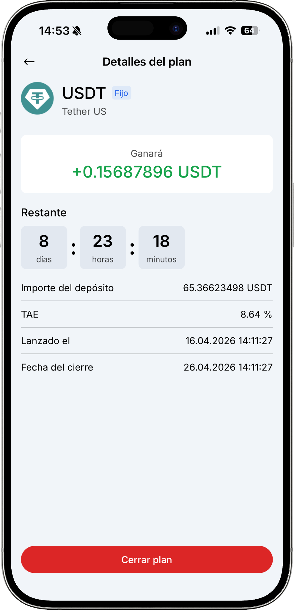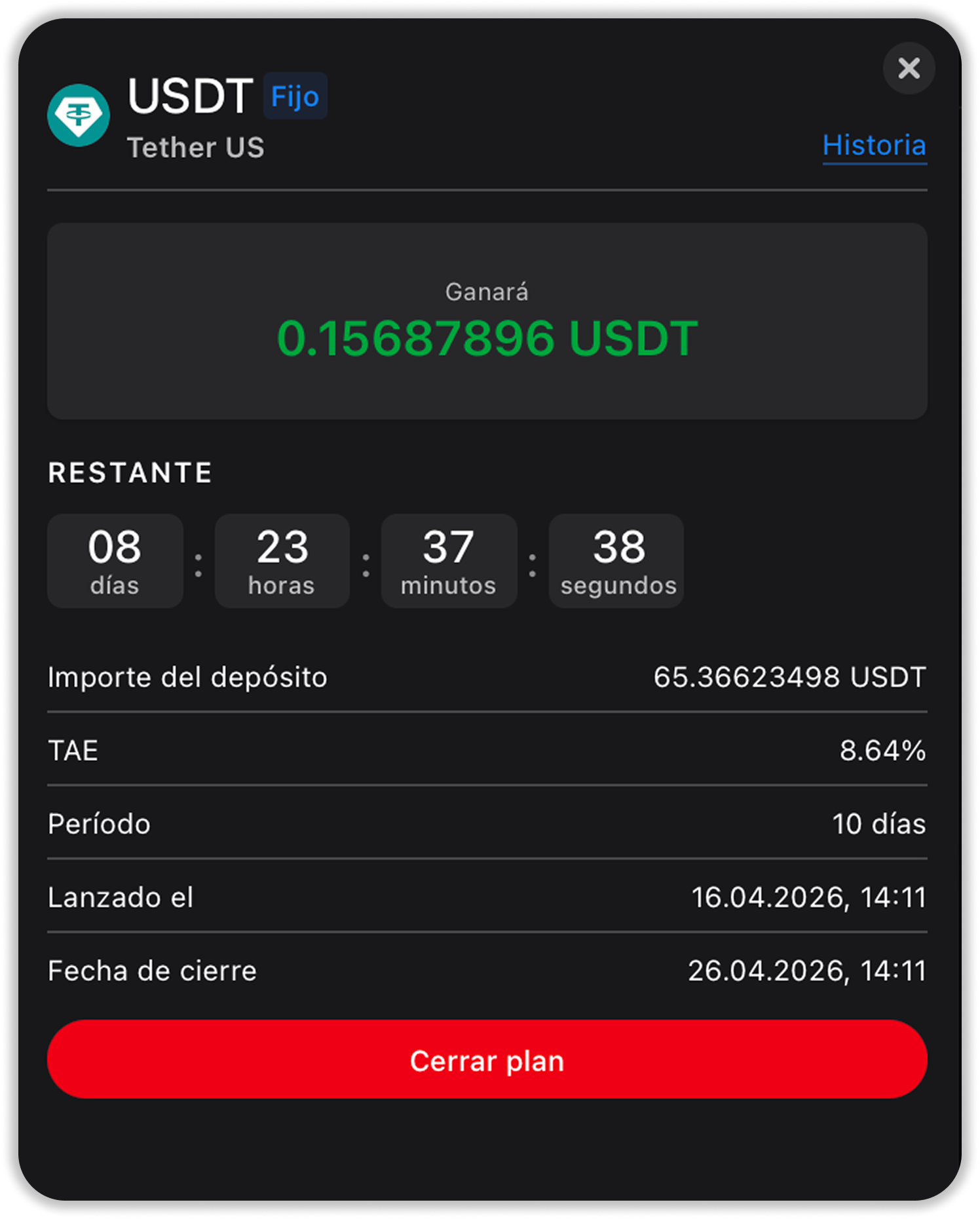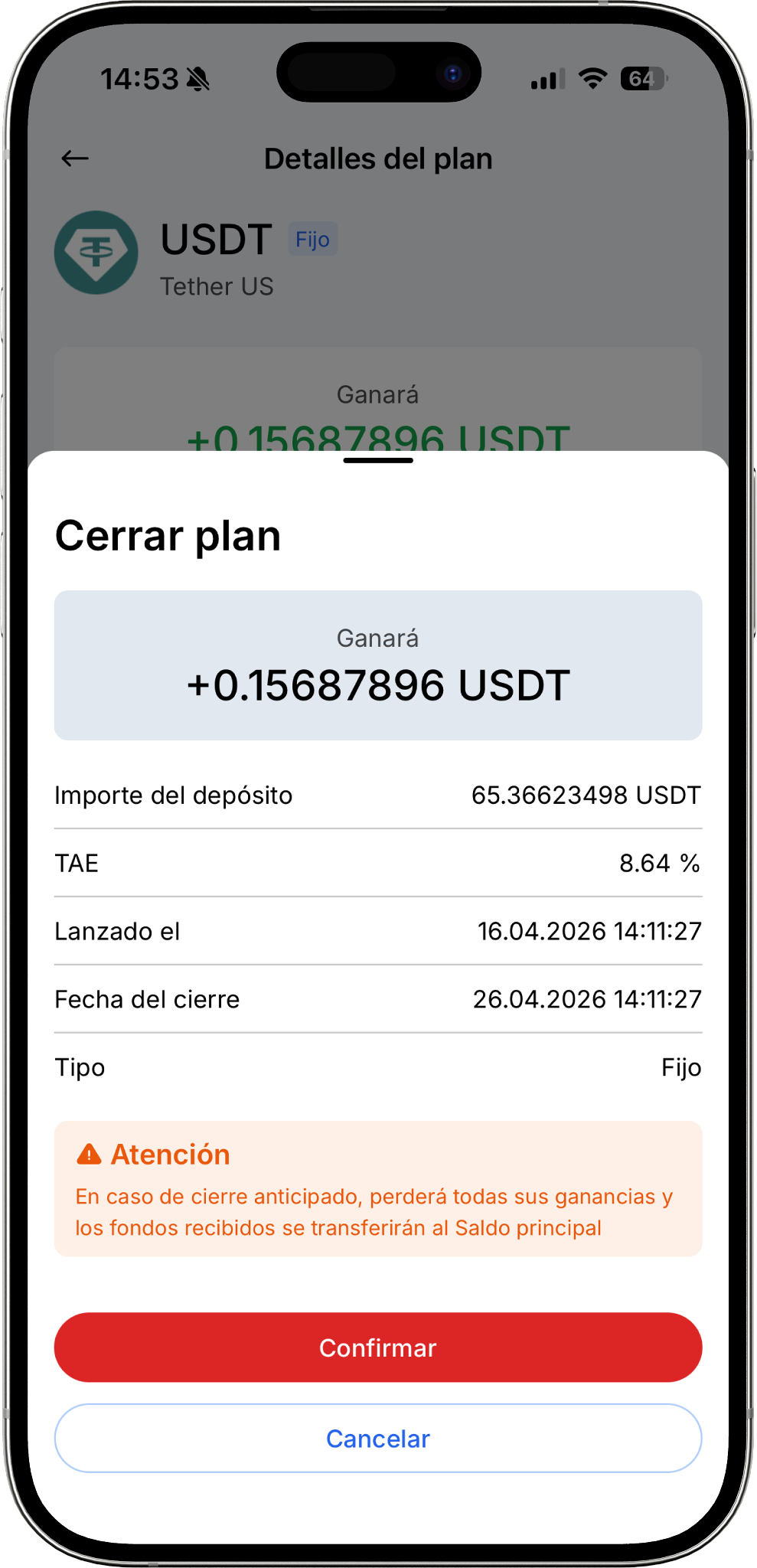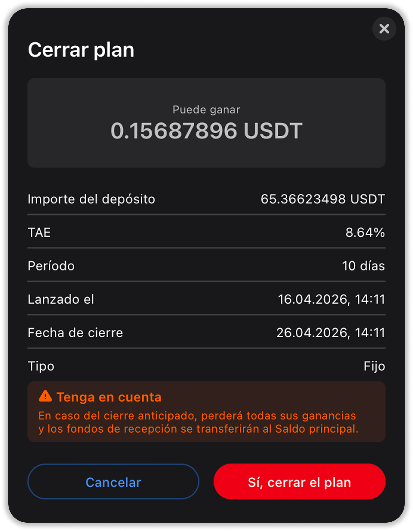 Puede cerrar el plan antes del plazo especificado, los fondos serán devueltos al Saldo principal, pero no recibirá intereses por conservarlos.