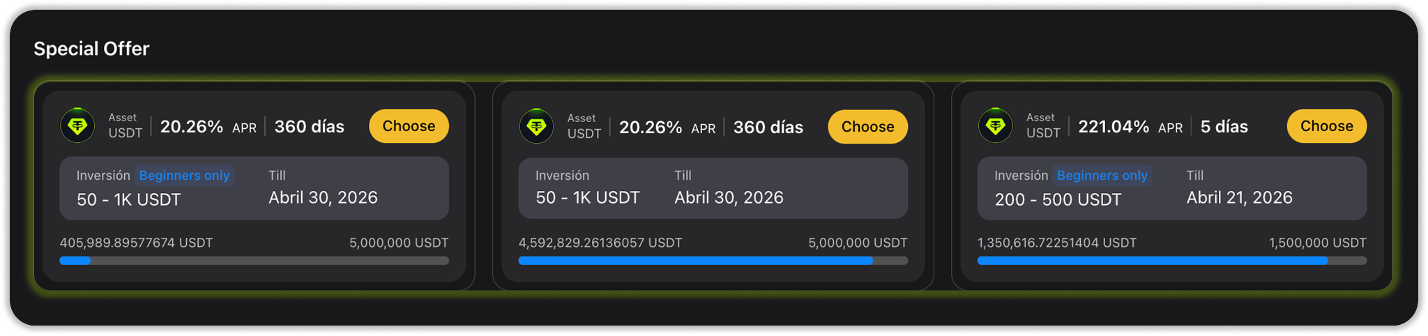 Tenga en cuenta: Algunos planes dentro de las ofertas especiales permiten invertir una sola vez. Si el usuario cancela la inversión tras acceder al plan, no será posible volver a invertir.