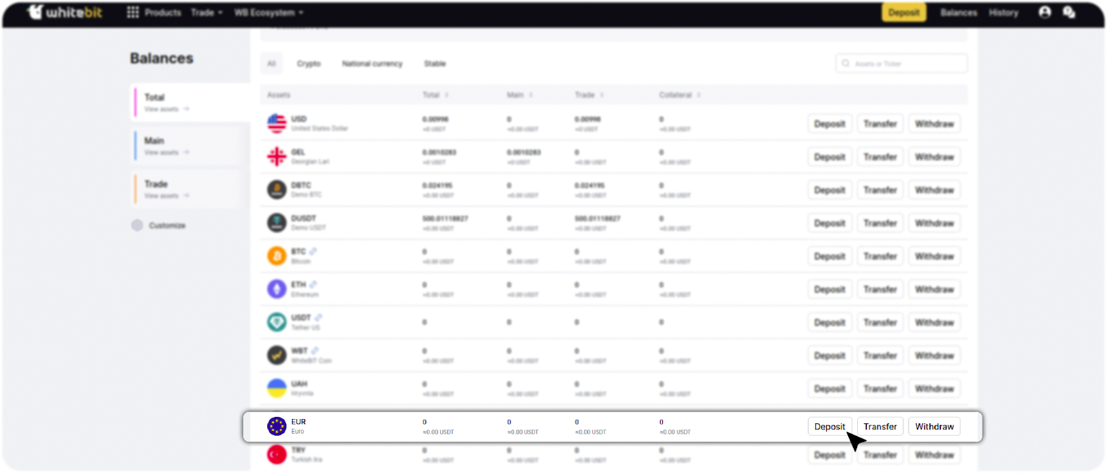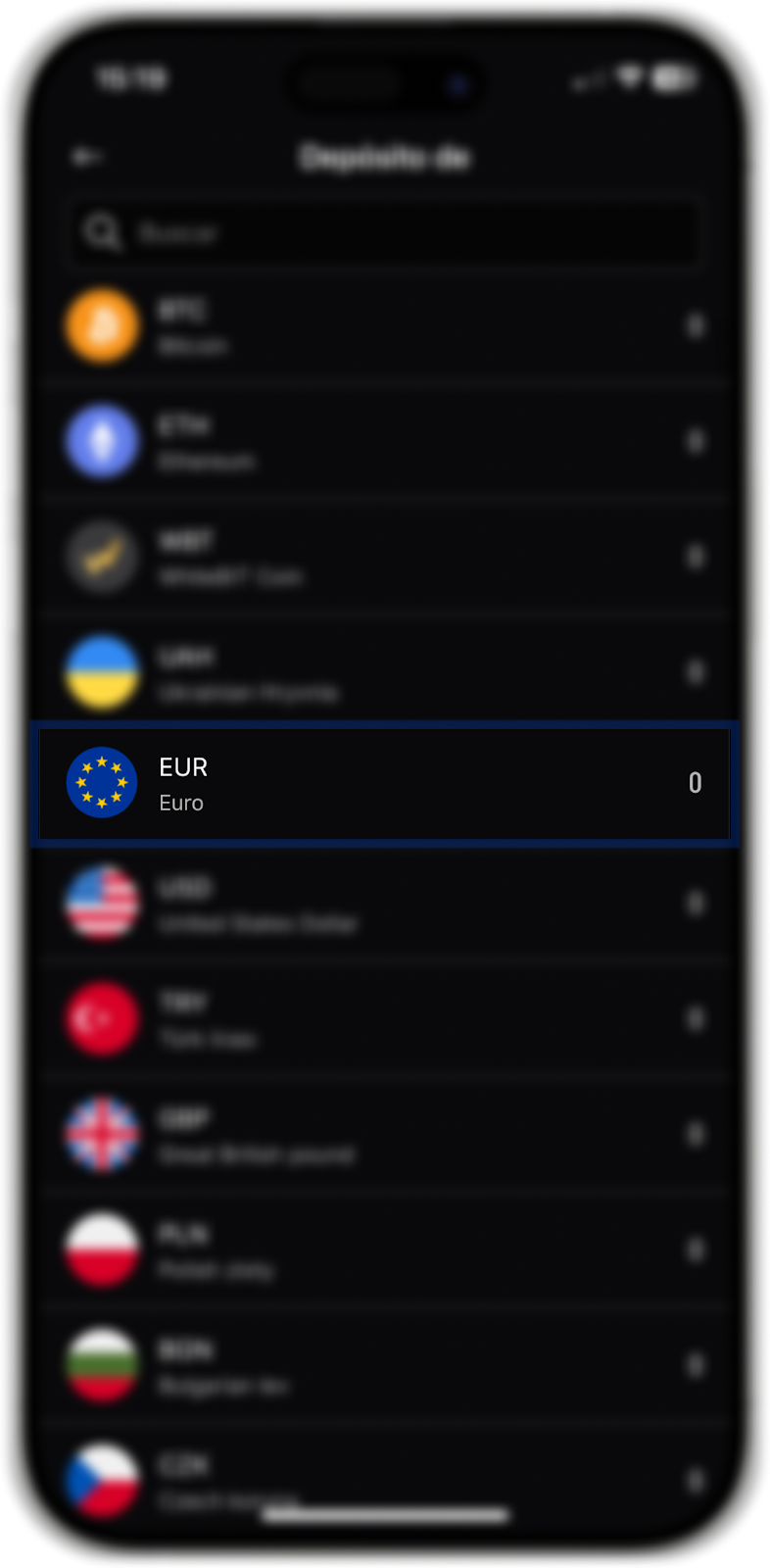 - Pulse "Depositar" en la línea frente al símbolo del euro (EUR).