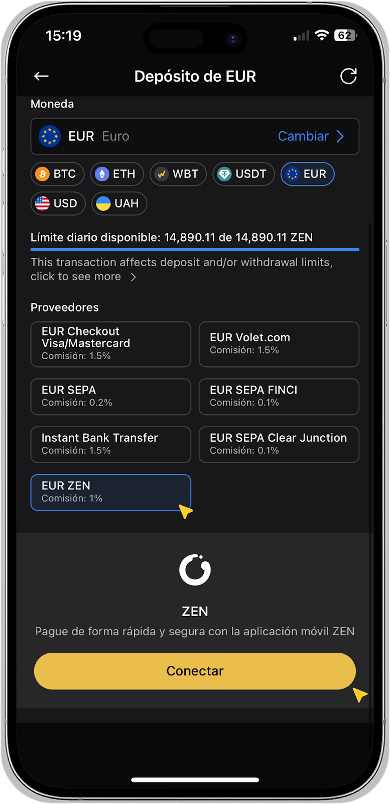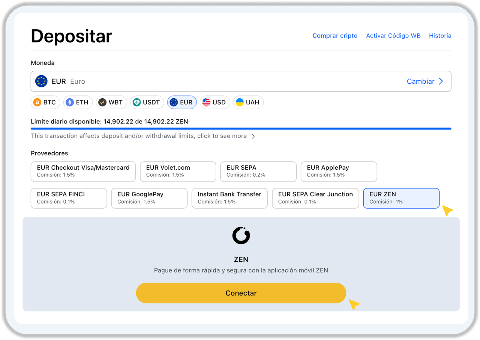 ZEN.com es una compañía internacional fintech. Actualmente, los usuarios de WhiteBIT tienen lan oportunidad de hacer depósitos en EUR (euro) utilizando el sistema de pago ZEN.