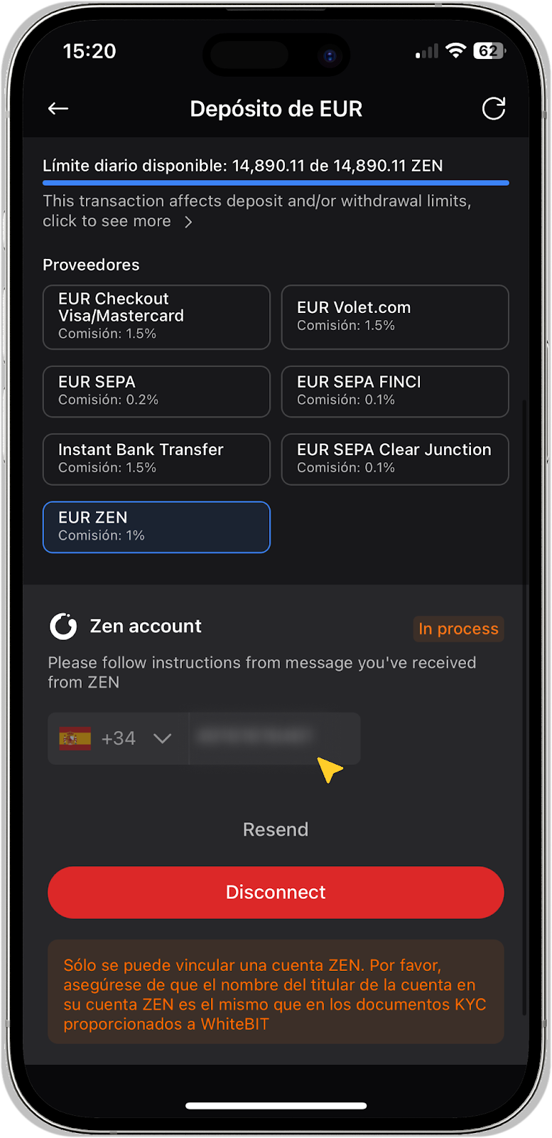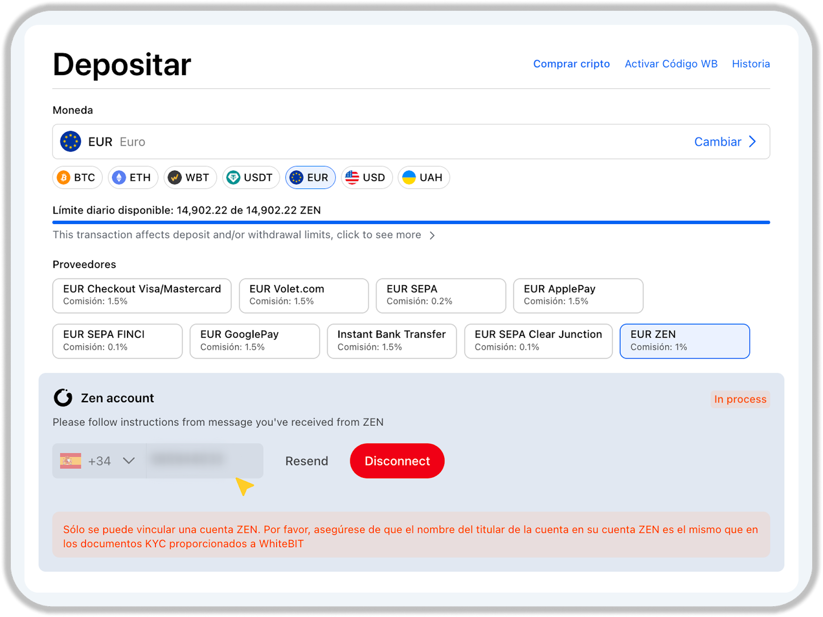 Importante: Solo puede vincular una cuenta ZEN. Asegúrese de que el nombre del propietario de la cuenta en su cuenta ZEN sea el mismo que el de los documentos para KYC proporcionados a WhiteBIT.