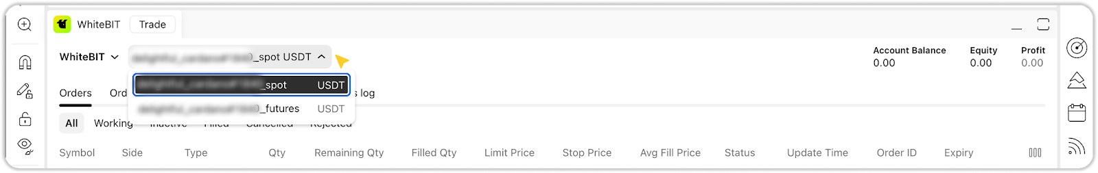 Nota: cuando se conecta una cuenta WhiteBIT a la plataforma TradingView, sólo está disponible la negociación de futuros - la negociación al contado y con margen no está disponible.