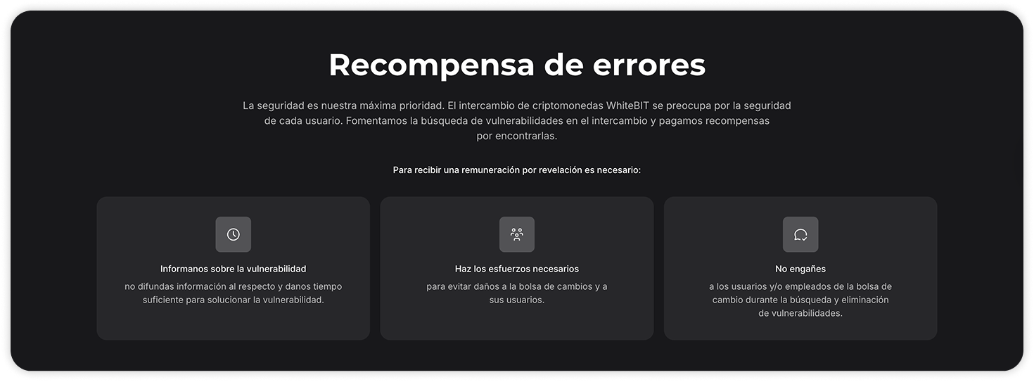 Bug Bounty es una actividad que permite obtener una recompensa por detectar diversas vulnerabilidades en la plataforma. Dado que la seguridad y fiabilidad son los principios fundamentales del funcionamiento de la plataforma WhiteBIT, hemos implementado el programa Bug Bounty, dirigido a la búsqueda de errores y vulnerabilidades.
