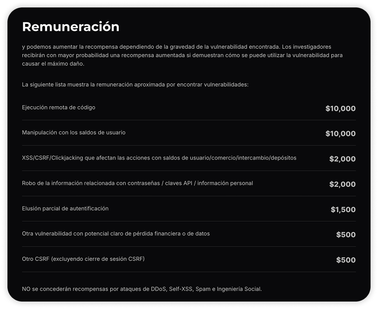 Tenga en cuenta: la plataforma determina el nivel de riesgo de cada error informado después de una revisión cuidadosa y de la confirmación de la existencia del error o vulnerabilidad. Es importante tener en cuenta que los ataques DDoS, Self-XSS, Spam y Social Engineering no son recompensados.