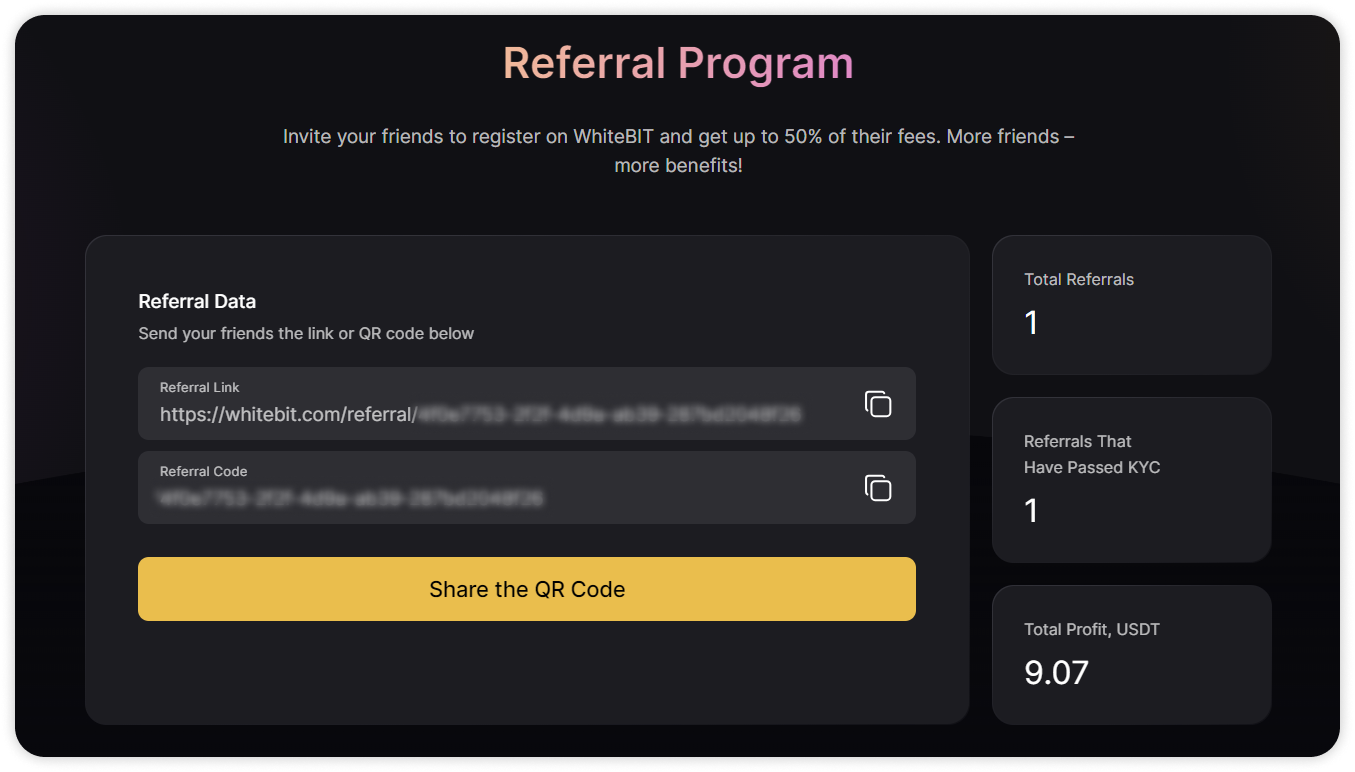 El programa de invitados en WhiteBIT ofrece la posibilidad de obtener beneficios del 40% al 50% de las comisiones comerciales pagadas por los referidos activos que usted haya invitado.