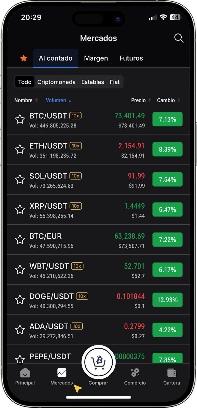 También puede utilizar la pestaña "Mercados". Utilice la búsqueda, seleccione el par disponible y haga clic en él. Serán redirigidos a la página del gráfico. Allí, haga clic en "Comprar" o "Vender".