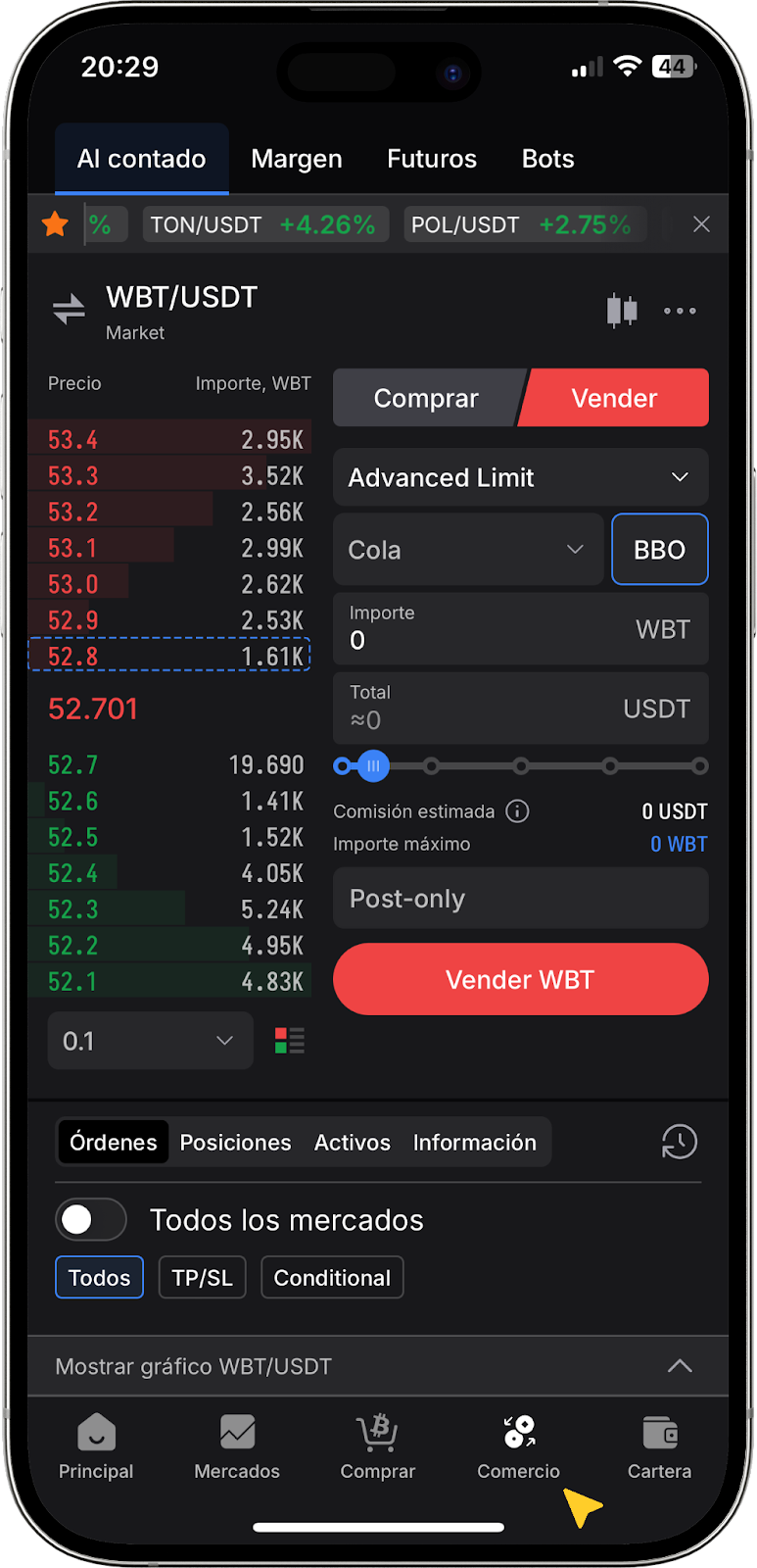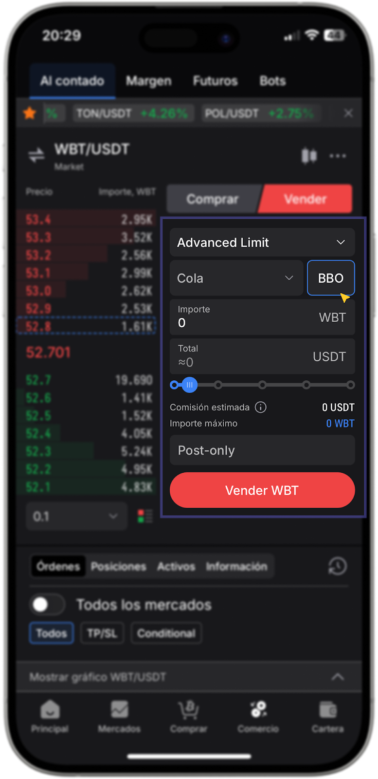 Veamos cómo colocar una orden limit o stop-limit con la opción BBO en la versión web del intercambio, así como en nuestra aplicación móvil.