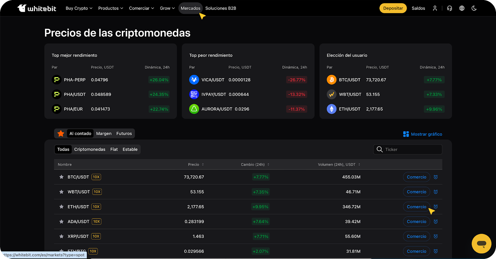 1. Vaya a la sección de "Comercio" y seleccione el par de activos desde el menú desplegable en la parte superior izquierda de la pantalla.