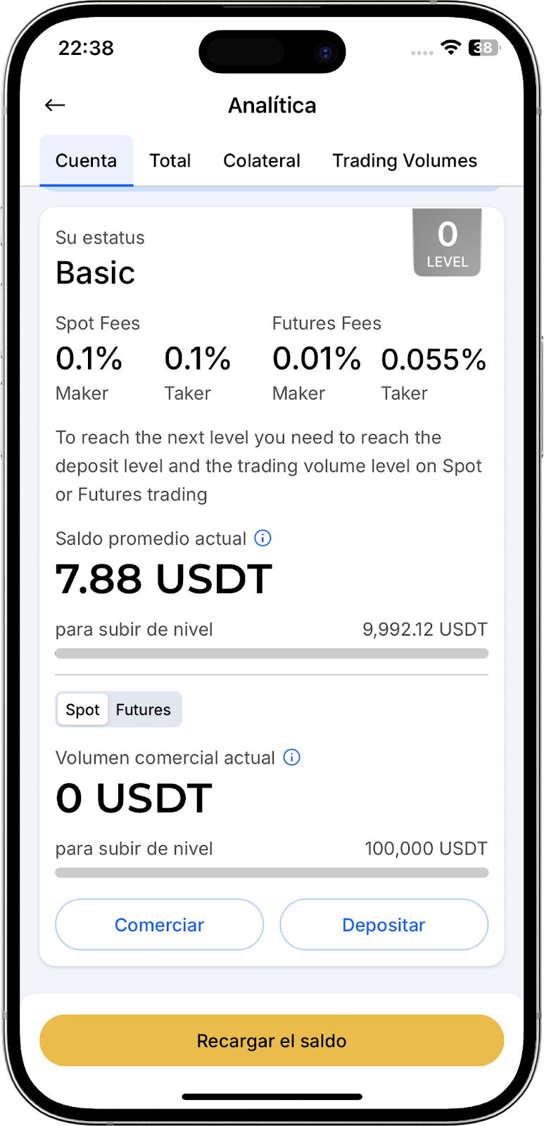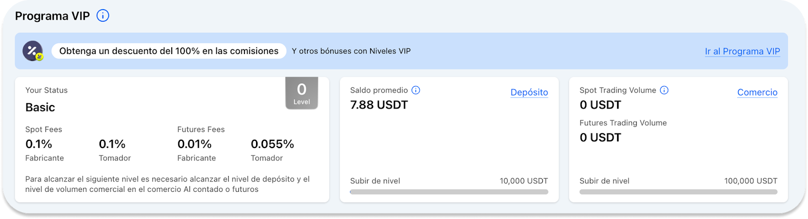 - РNivel del programa VIP — aquí se muestra su nivel actual en el programa VIP, con una descripción detallada de sus beneficios y privilegios asociados. También se incluye información sobre la cantidad de activos digitales necesarios para mejorar su nivel VIP y reducir las comisiones comerciales. Puede obtener más detalles en la página "Programa VIP" y en nuestro artículo enlazado.