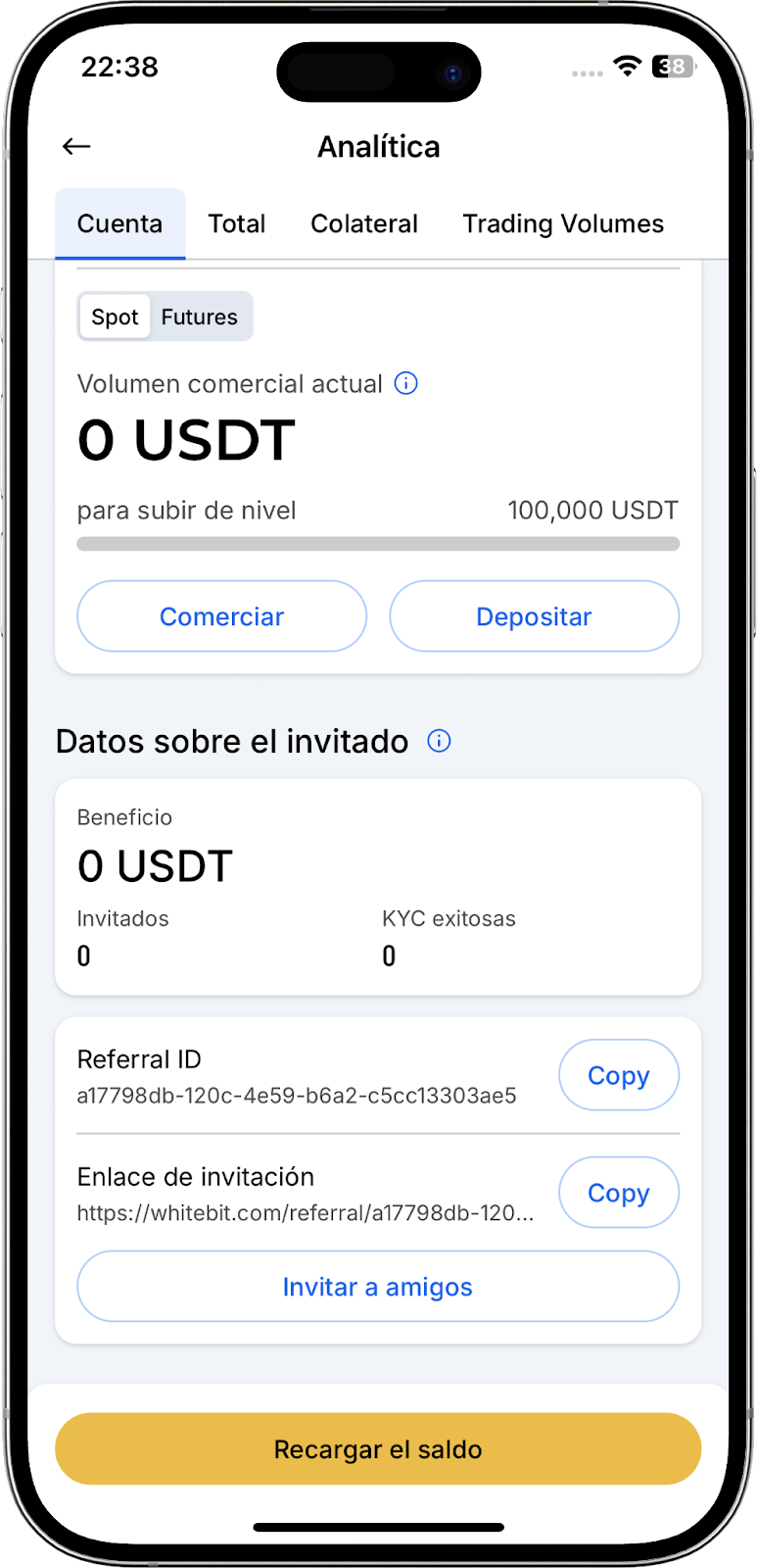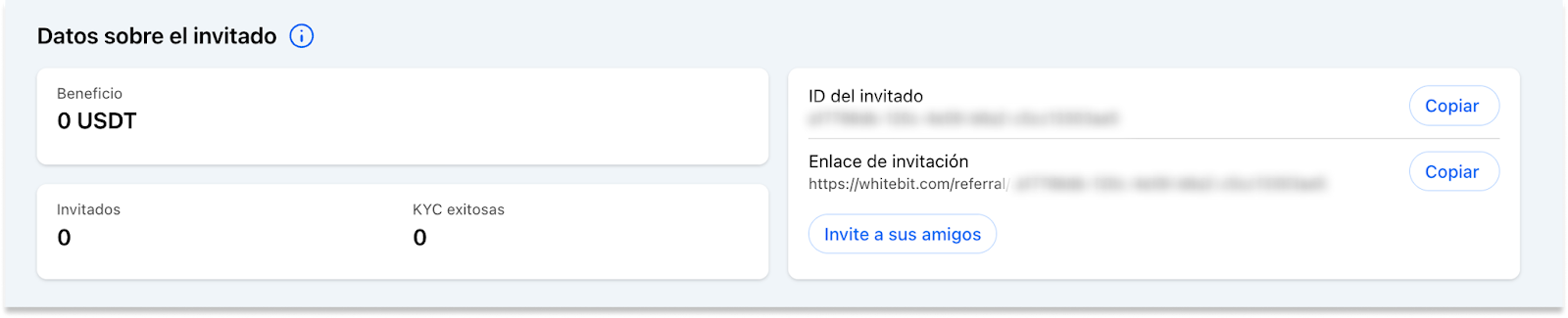- Estado del programa de referidos — visualice el estado de su participación en el programa de referidos de WhiteBIT. El panel muestra la cantidad de usuarios referidos, los ingresos obtenidos de estos referidos y otros indicadores clave. Obtenga más información sobre las ventajas en la página "Programa de referidos" y en nuestro artículo enlazado.