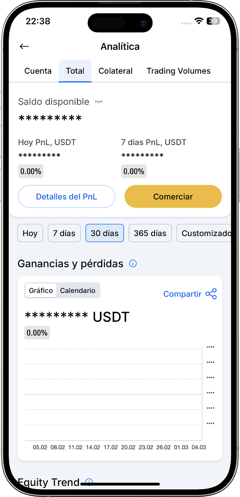- Equity Trends (Tendencias de Equidad) — visualización de los cambios en el balance de la garantía a lo largo del tiempo, conocida como las tendencias de equidad. Al visualizar estas tendencias, puede rastrear fluctuaciones y patrones en el balance de su garantía, lo que ayuda a tomar decisiones estratégicas.