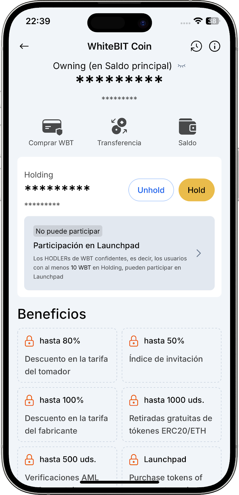 - Estadísticas de WBT Holding — acceso a estadísticas detalladas de su holding de WhiteBIT Coin (WBT). El panel muestra la cantidad de WBT que posee y mantiene, así como el monto necesario para avanzar al siguiente nivel. Descubra más sobre las ventajas del WBT en la página "WBT Resumen" y en nuestro artículo enlazado.