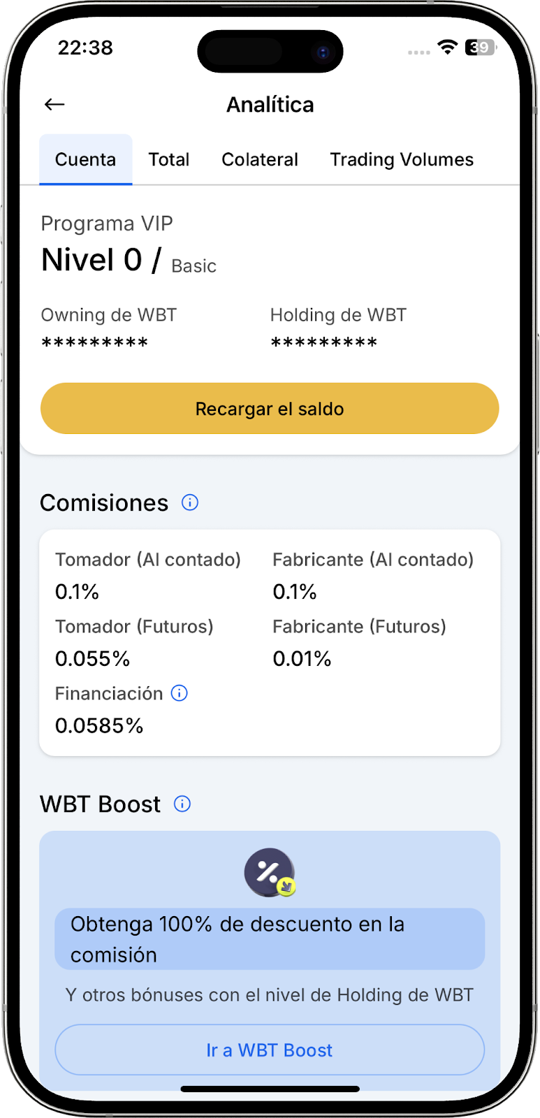- Tarifas comerciales — información sobre las tarifas comerciales actuales, incluidas las comisiones Maker y Taker. Los usuarios pueden ver los descuentos aplicables según sus niveles VIP y WBT Holding.