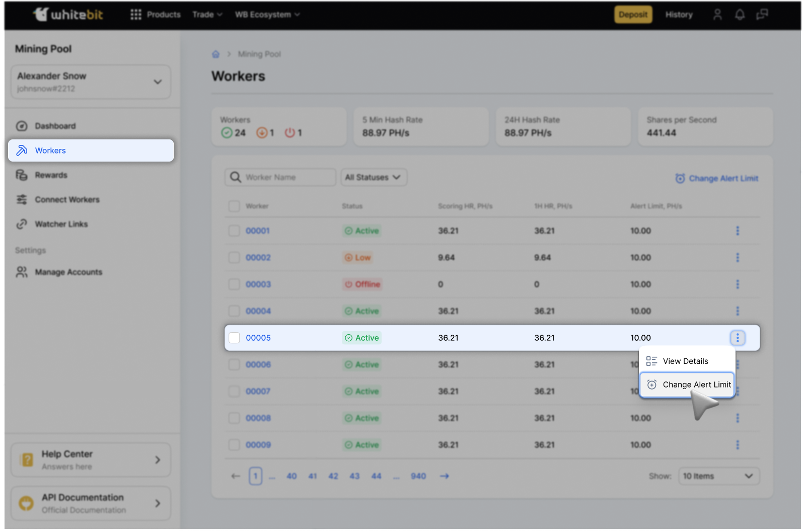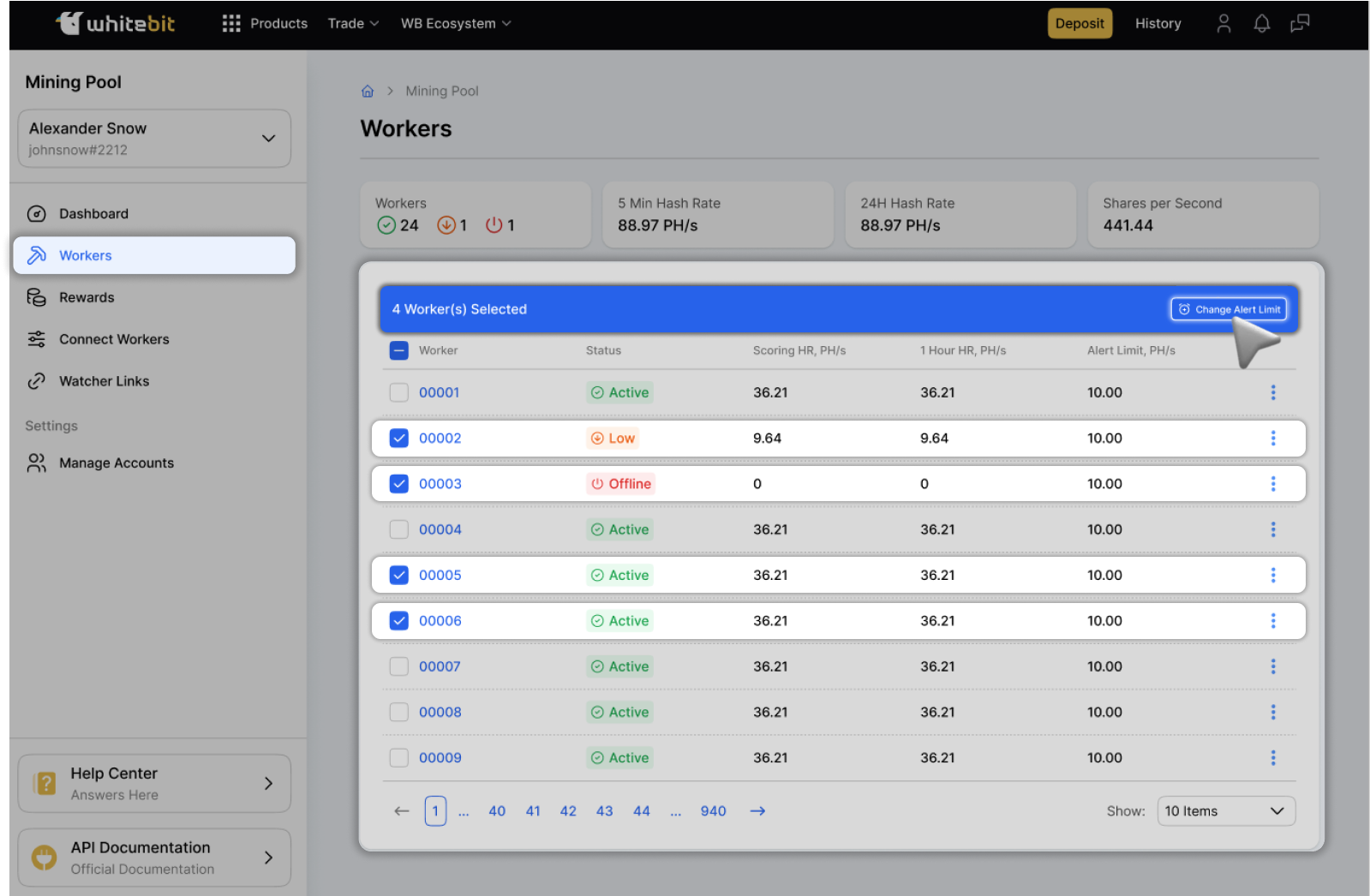 - Vaya a Mining Dashboard — Seleccionar Worker(s) — Cambiar Límite de Notificación. Puede configurar los Límites de Notificación individualmente para un solo trabajador o para varios trabajadores.