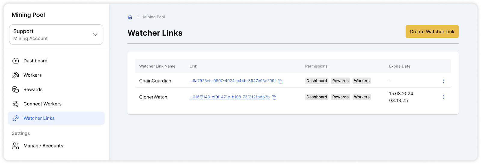 Nota: Al usar Watcher Links en WhitePool, es importante saber que existe un límite de tres Watcher Links por usuario. Puede crear hasta tres enlaces únicos para supervisar la actividad de minería.