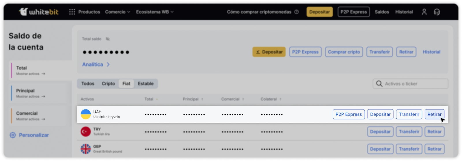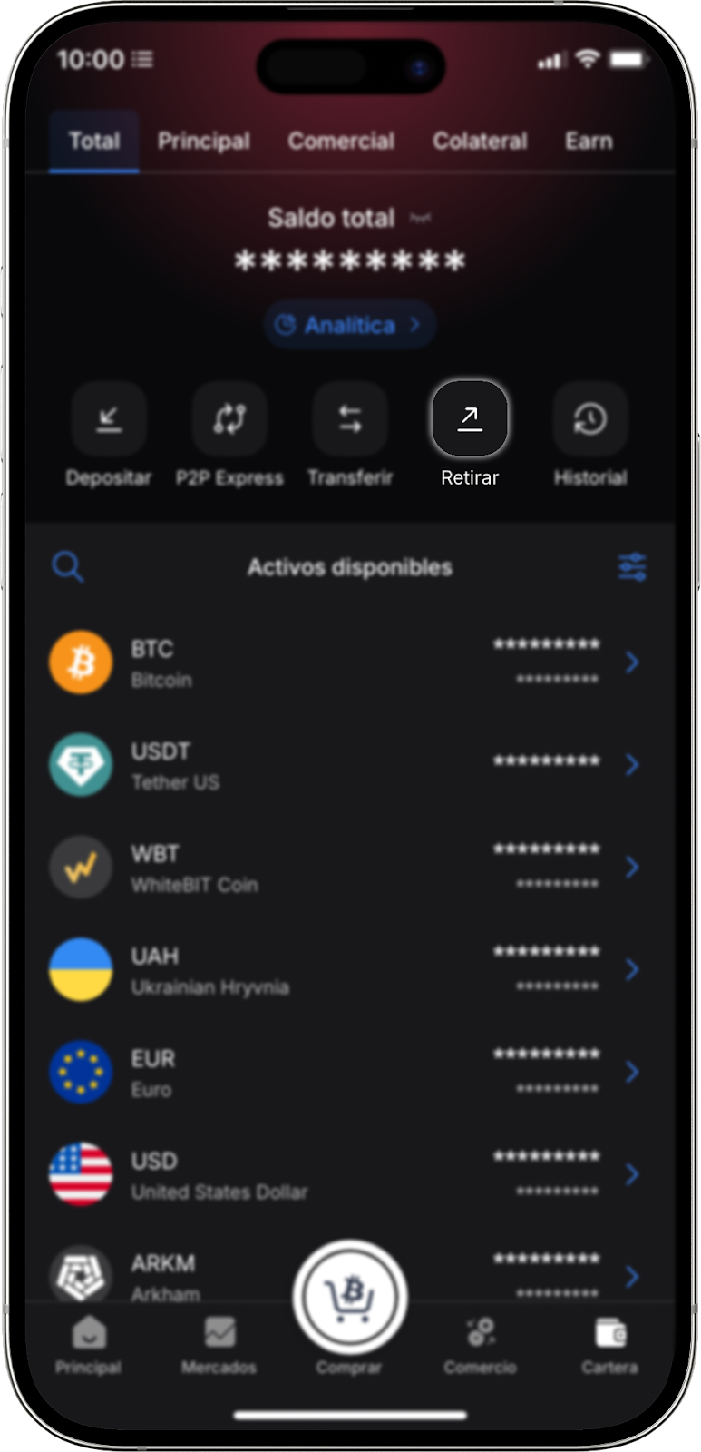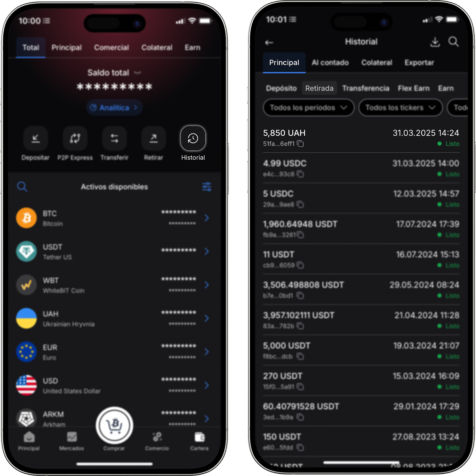 Después de realizar el retiro, puede consultar los detalles del pago. Para ello, vaya a la sección "Cartera" en WhiteBIT y pulse el botón "Historial".