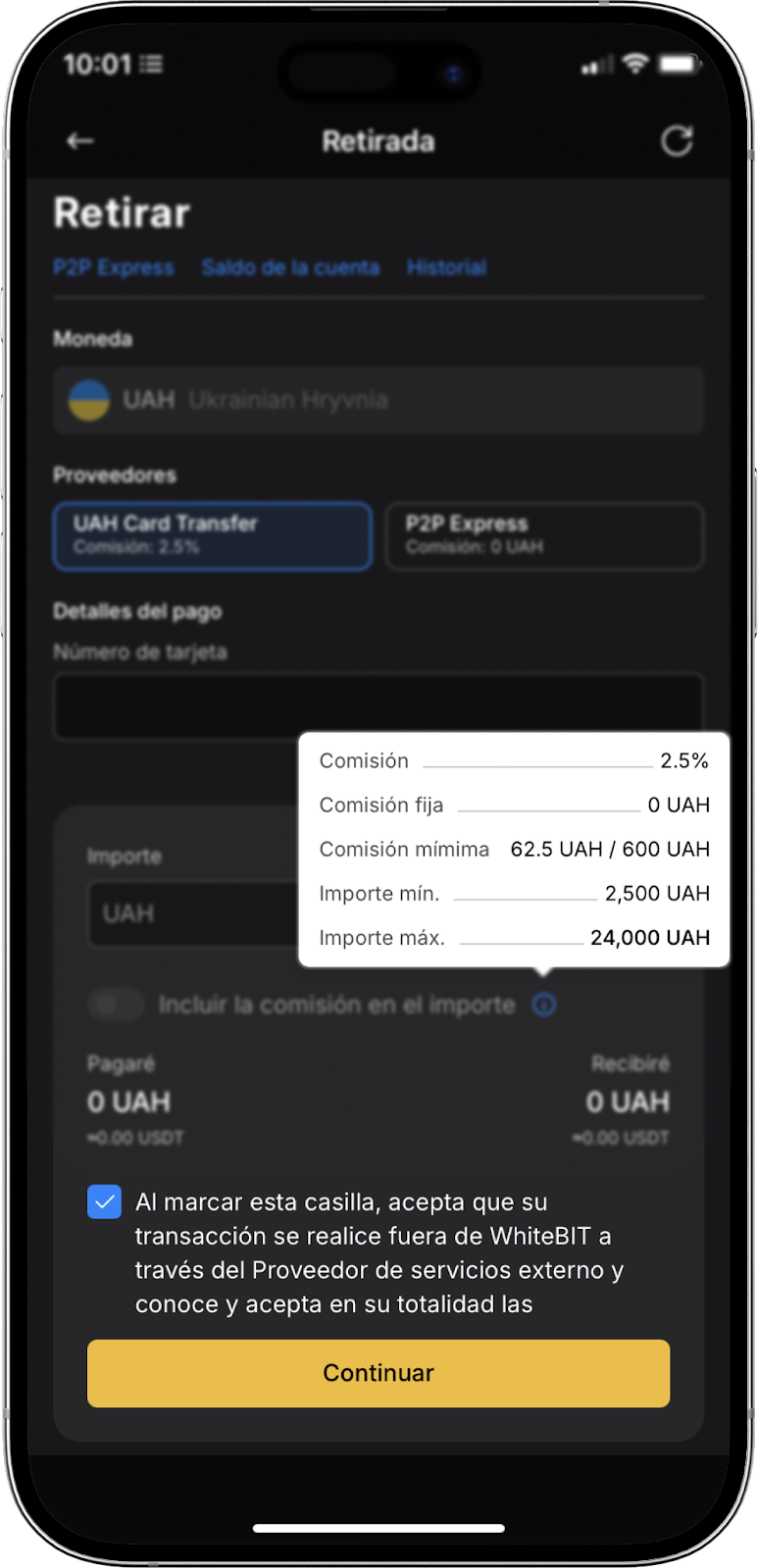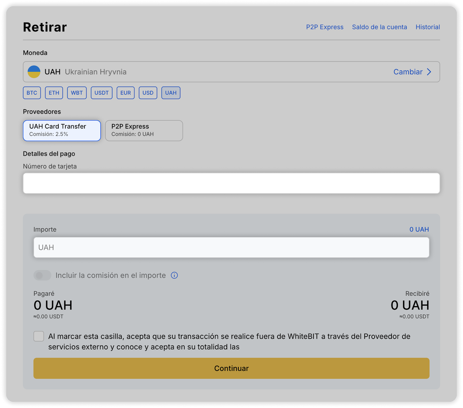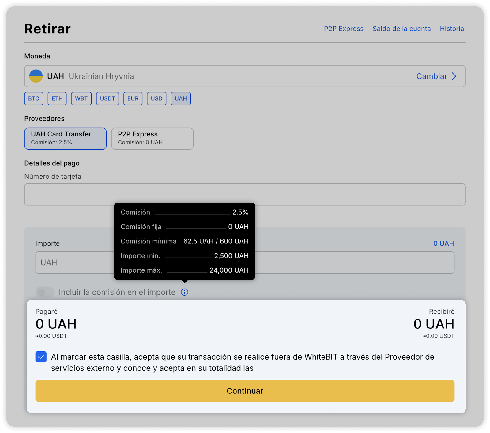 Marque la casilla que indica que la transacción se realizará fuera de WhiteBIT mediante un proveedor externo de servicios. Luego haga clic en "Continuar".