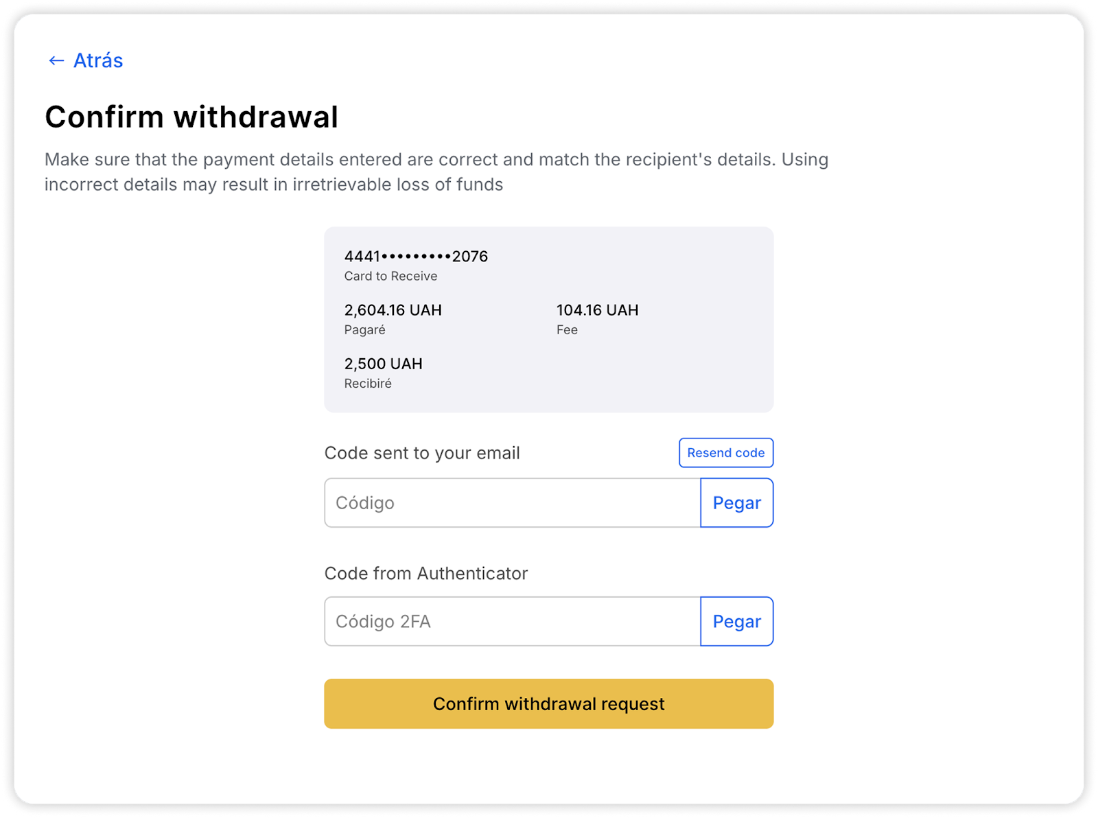 Para confirmar el retiro, deberá ingresar un código de verificación que se enviará a su correo electrónico. Este código será válido durante 180 segundos. Si tiene habilitada la autenticación de dos factores (2FA), también se le pedirá ingresar el código desde la aplicación correspondiente.