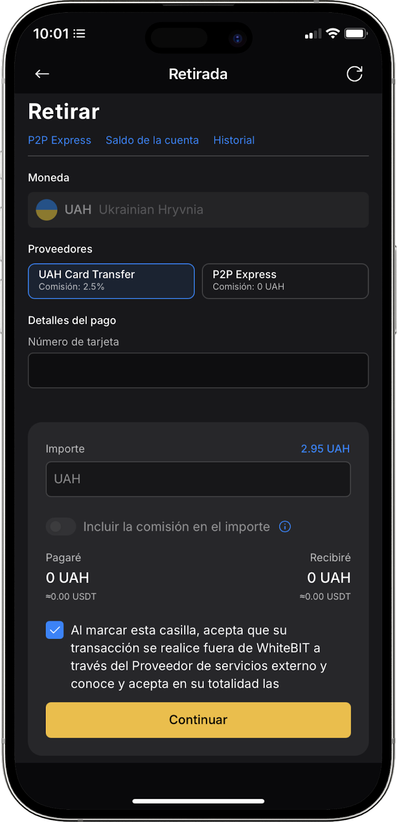 Marque la casilla que indica que la transacción se realizará fuera de WhiteBIT mediante un proveedor externo. Luego pulse "Continuar" y confirme la transacción.