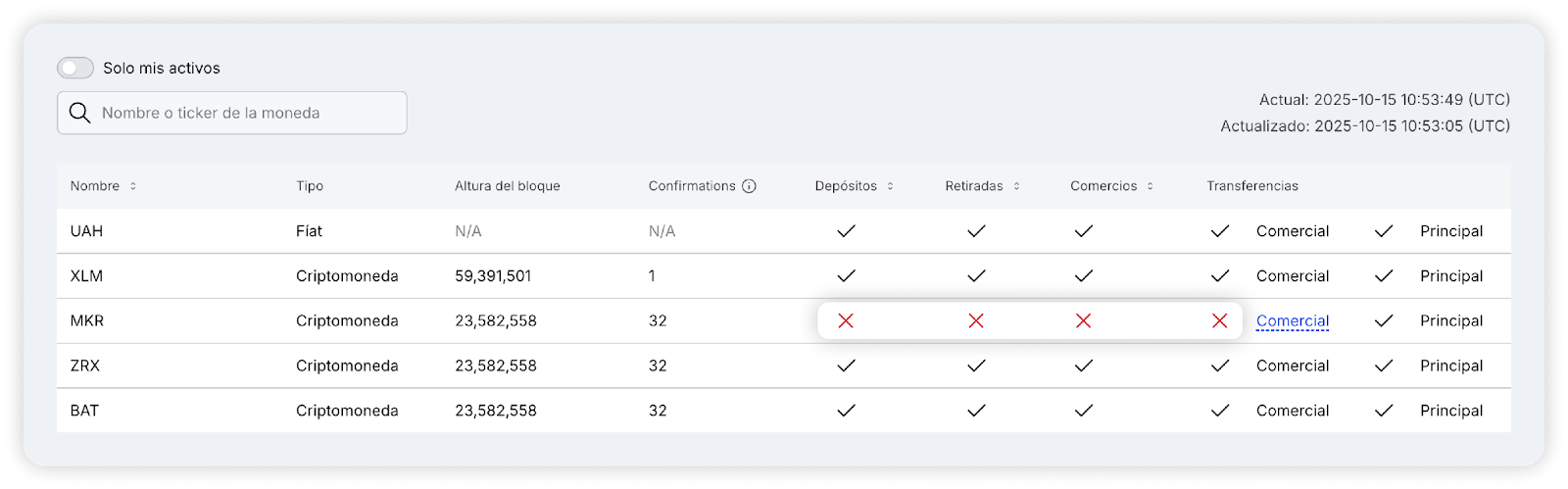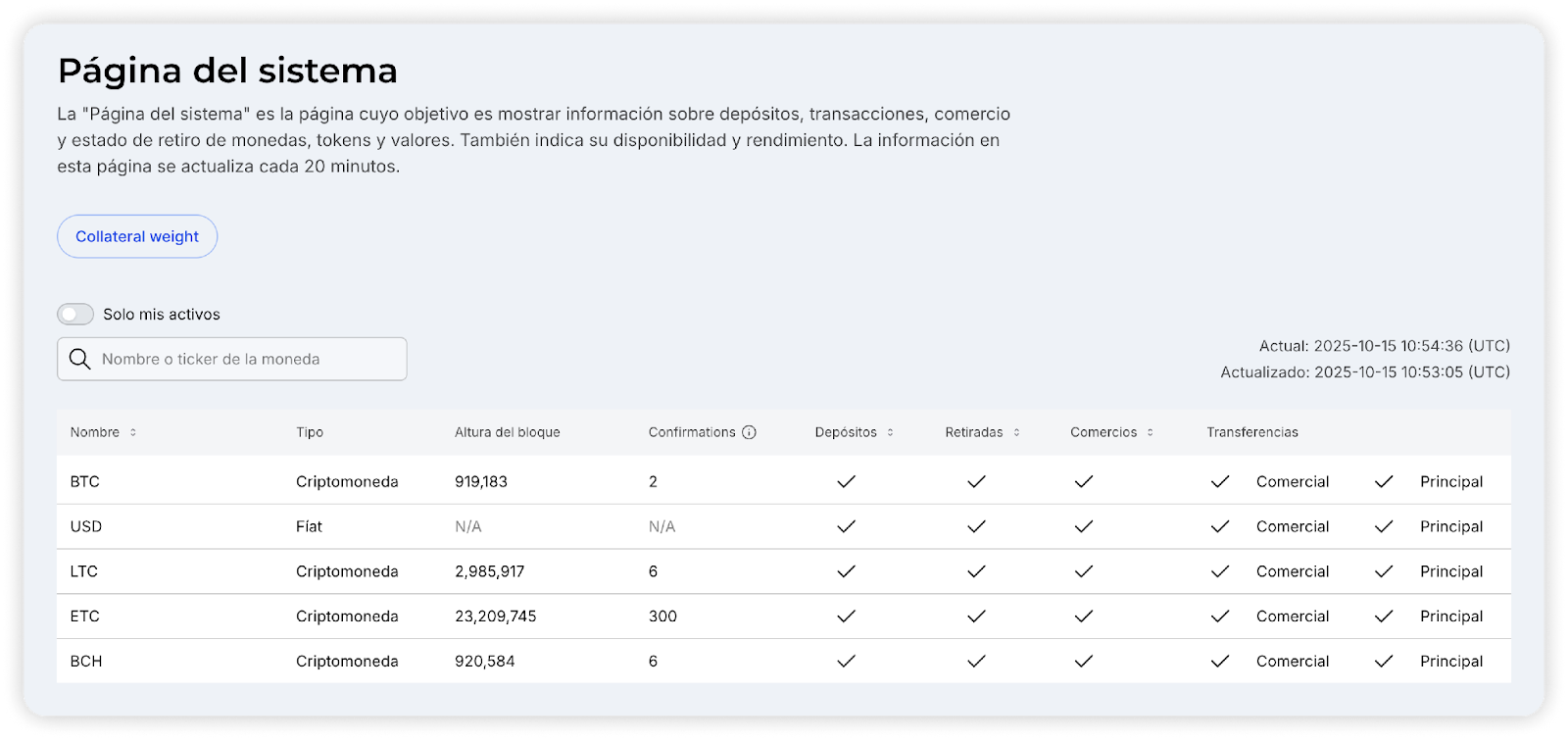 En la parte superior de la página, usted puede elegir filtrar los activos, mostrando solo aquellos que tiene en su saldo, o usar la búsqueda para encontrar rápidamente los activos deseados. También puede ordenar las columnas correspondientes para su comodidad. En la parte derecha de la pantalla se muestra la hora actual en UTC y la hora de la última actualización de los datos.